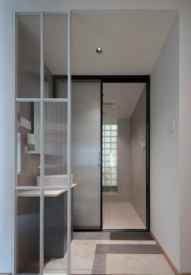 卫生间干湿分离,内部规划了洗漱区,马桶区,淋浴区,地垫与玻璃隔断的花纹相呼应,大面积的纯白让客卫干净简约