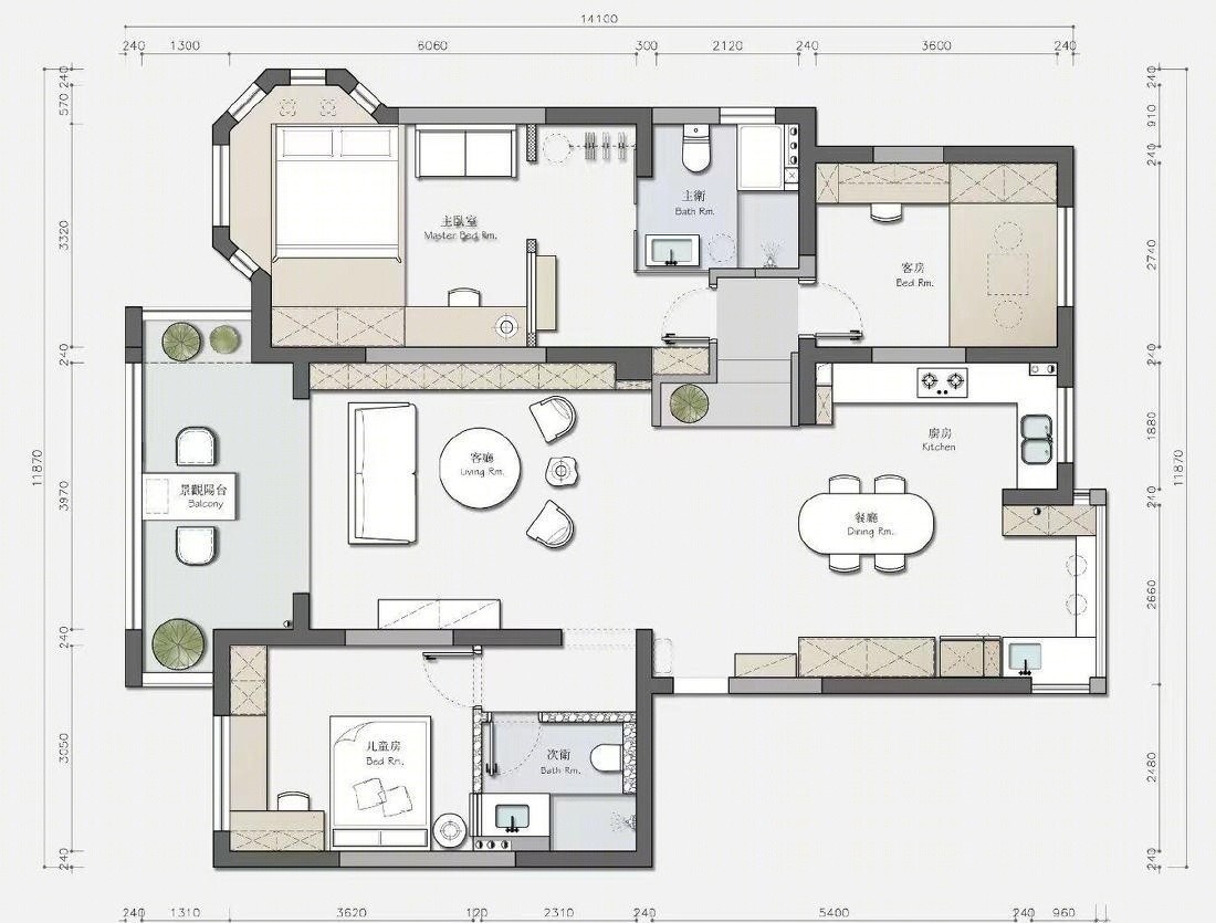 阳台位置改成景观阳台,玻璃窗改为一体落地窗,右侧原来是空调外机平台,将这块区域扩进阳台