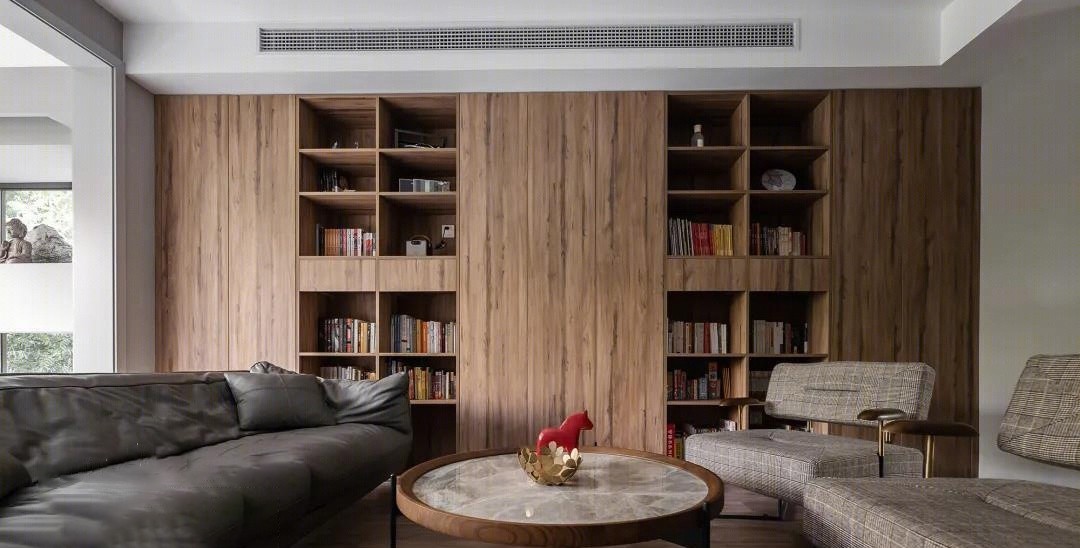 客厅没有传统的电视柜和电视,取而代之的是一整面墙的大书柜,因为男女业主平时都非常喜欢看书