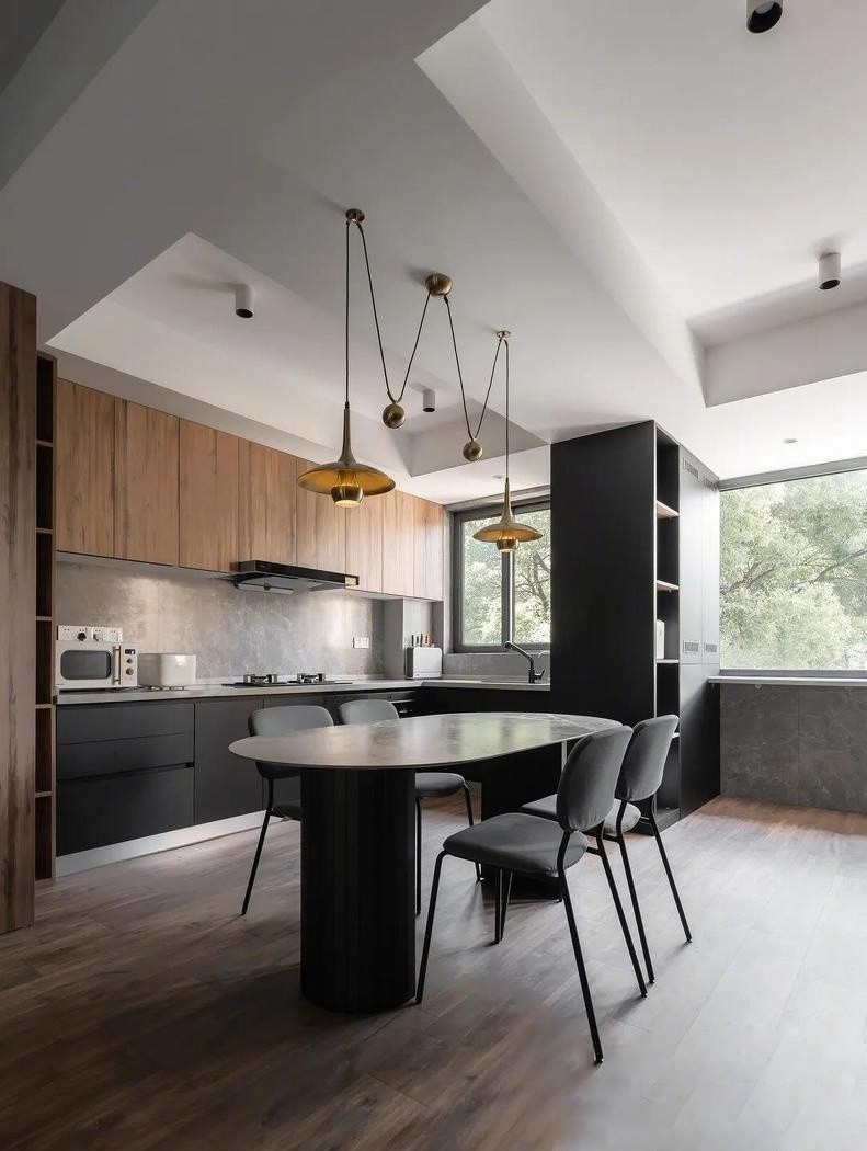 餐厅与厨房空间打通后,打造成餐厨一体,使得空间更开阔,功能也更强,设计师将餐厅的高柜与错层上方梁的部分对齐,视觉上更加整齐统一。