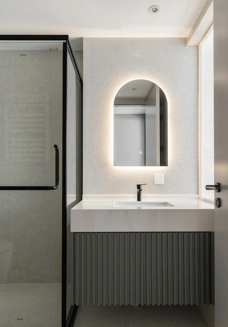 次卫因为有了儿童房的采光,显得没有那么暗,镜柜下方的面板选用与儿童房家具一致的颜色款式。别致的半圆形镜灯造型,美观又温馨。