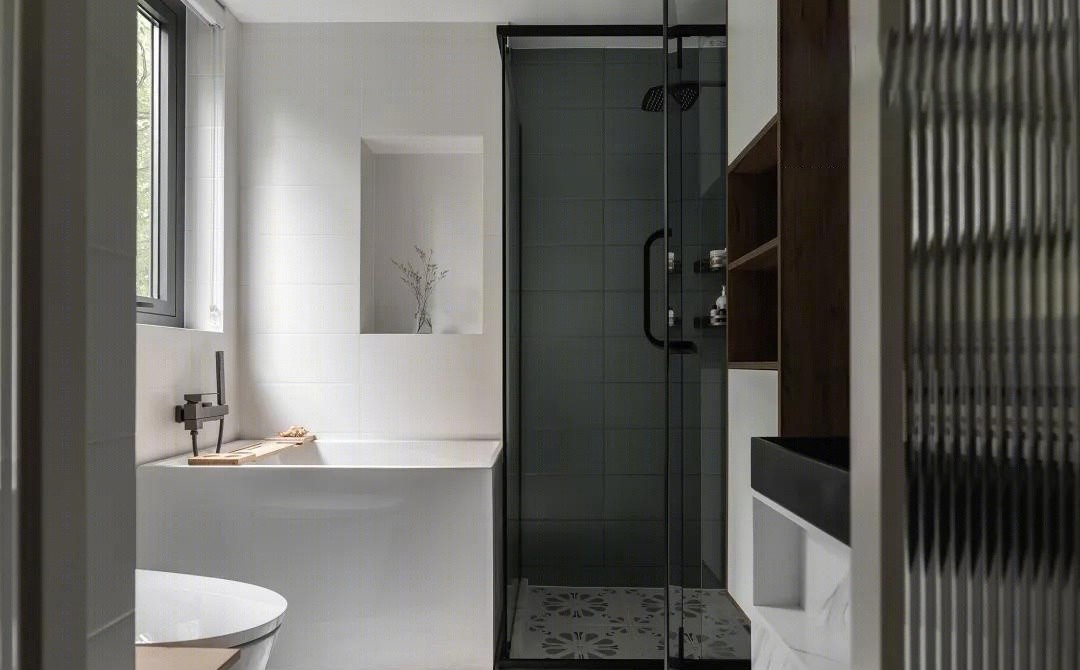 主卧卫生间设计了一个尺寸比较小的浴缸,偶尔家人需要泡澡,浴缸也是需要的,因为卫生间尺寸不大,只能牺牲一点点淋浴房的空间。