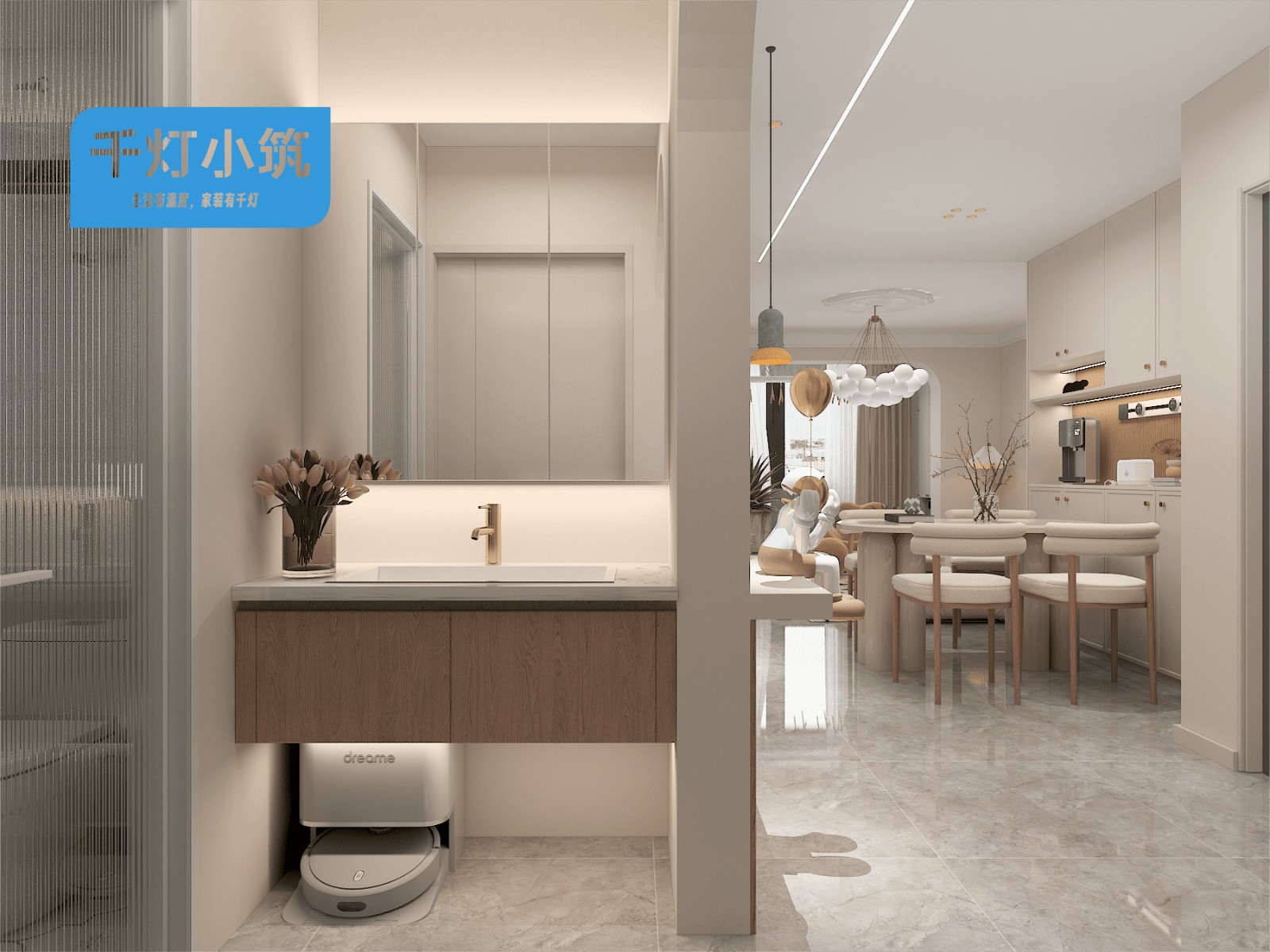悬挂式浴室柜是奶油风盥洗室的理想选择,不仅方便清洁,还能增加储物空间。柜体可采用奶油色或原木色,搭配简约的线条设计,与整体风格相协调。此外,可以加入一些温馨的装饰元素,如毛巾架、镜子、香薰等,提升空间的舒适感。