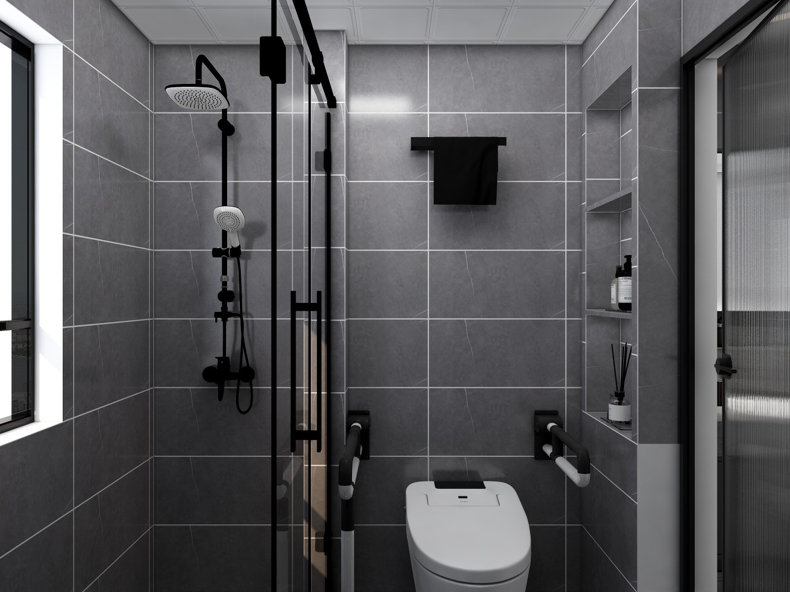 内部干湿分离,用挡水条+玻璃做隔断,增加室内采光的同时,还可以避免淋浴时水花四溅