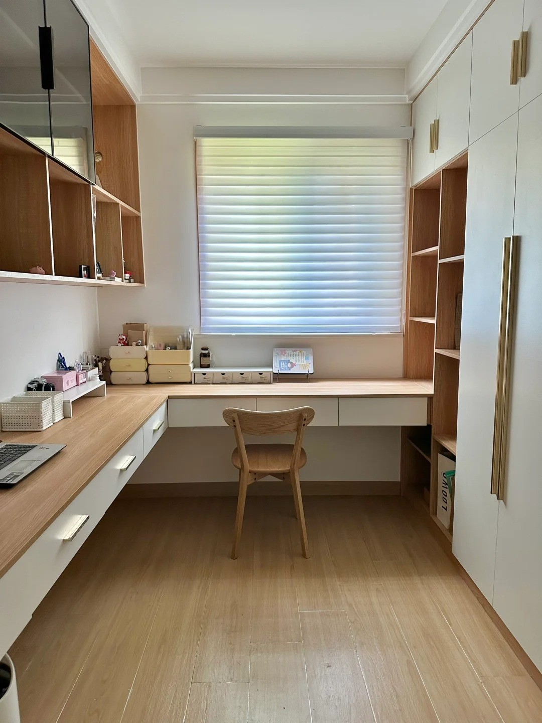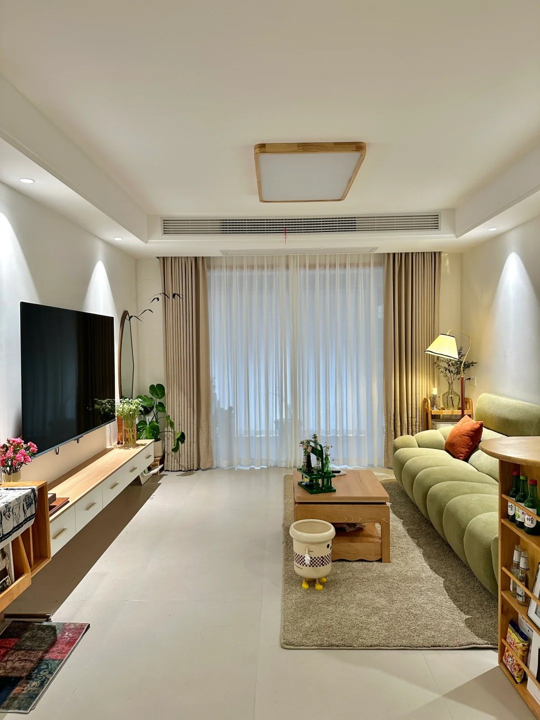 全屋白色乳胶漆,没有复杂背景,墙整体原木色+白色客厅,白蜡木的茶几和整体都很搭卧室不大,但是很温馨。床边铺上春日地毯,阳光洒到房间有被温暖到,保留房子原有格局,轻硬装重软装,而业主两个人都是最喜欢书房和客厅的,下班后窝在沙发追剧,或者都在书房办公看书,大概家就是这样子的吧,不需要复杂的装饰,简简单单、舒适就好。
