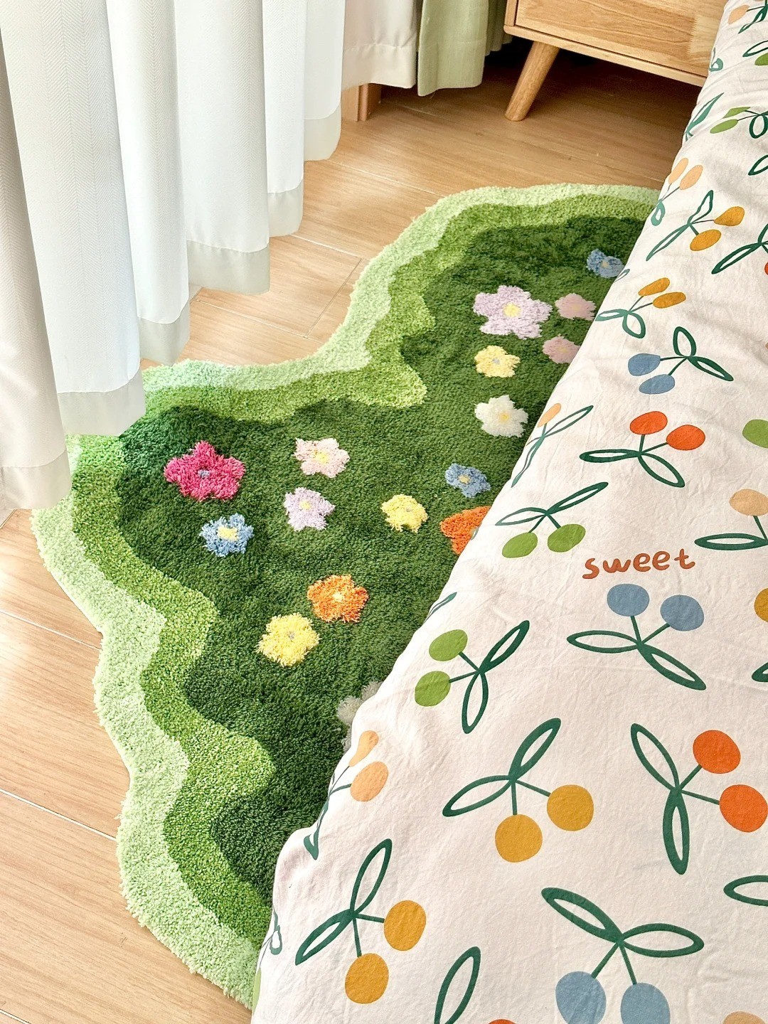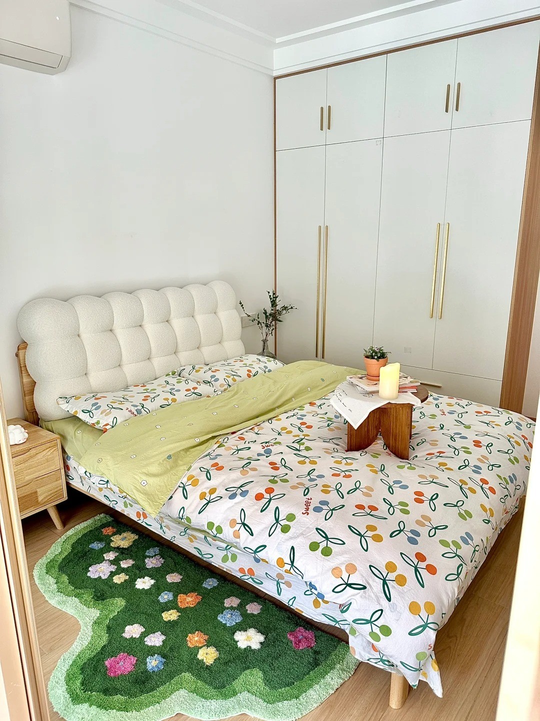 大白墙搭配小碎花的床品,绿色草地地毯,看起来很清新,很舒心。
