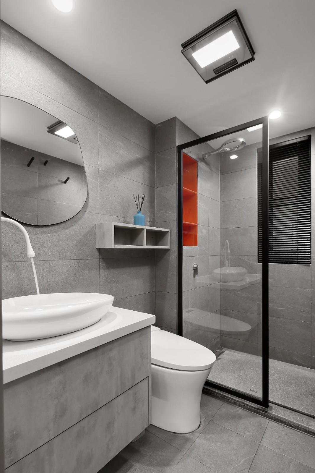 墙和地砖用了统一的灰色,同样做了橘色点缀,综合空间中的色感。