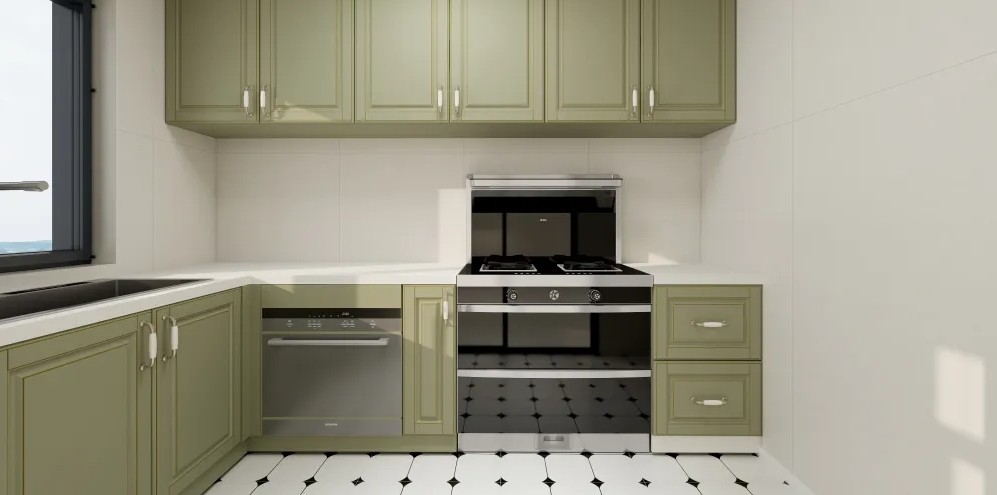 采用浅绿色的橱柜,搭配白色拉手。 操作台面选用石英石材质。 安装嵌入式烤箱和冰箱。