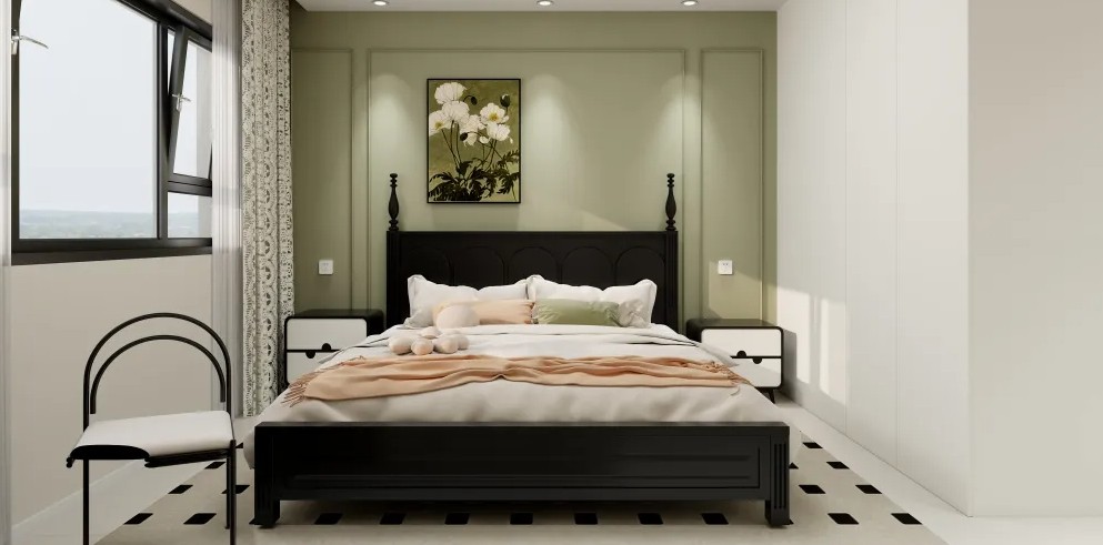 地面:铺上柔软的地毯。 墙面:淡绿色的丝绸墙布,床头背景墙有石膏线线条处理。 床:欧式四柱床,床幔选用轻柔的纱质材料。