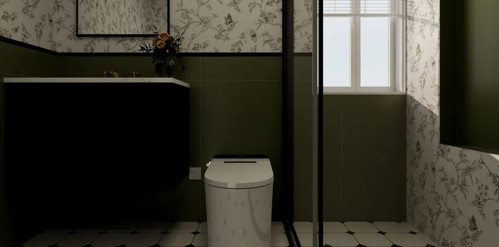 洗漱台选用大理石台面,搭配复古的水龙头。 采用干湿分离设计,以白色瓷砖为主