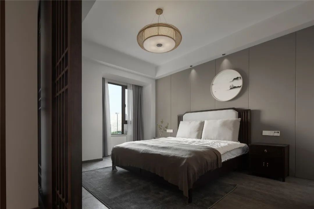 ▲卧室床头墙是卡其色的硬包背景墙,中间挂一幅圆形的装饰画,布置软质靠背的实木床,素雅干净的床单,灰色木地板的地面,布置地毯、深色床头柜,也带来了一个儒雅端庄的睡眠氛围。
