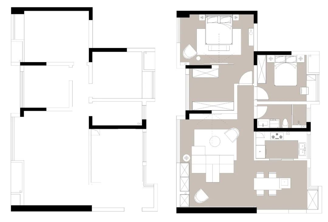 ▲玄关在靠近餐厅区域,大门门背后定制上鞋柜收纳,餐桌与中岛台连为一体的定制设计,显得简约大方而实用,让餐厨空间更加***有趣。