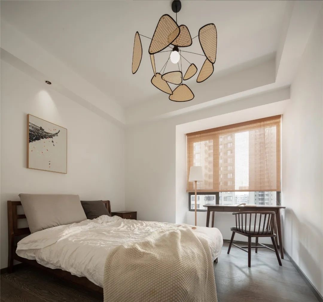 ▲次卧在简约大方的空间基础,布置实木床、床头墙挂一幅装饰画,布置素净的床单,吊灯也是有着屏风点缀的创意造型,让空间显得更加儒雅。靠窗位置摆上一套实木成品书桌椅,一盏落地灯、窗户是木色的百叶帘,整体空间显得儒雅而舒适端庄。