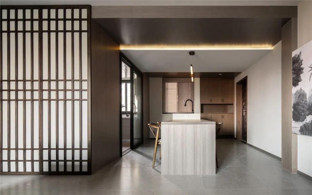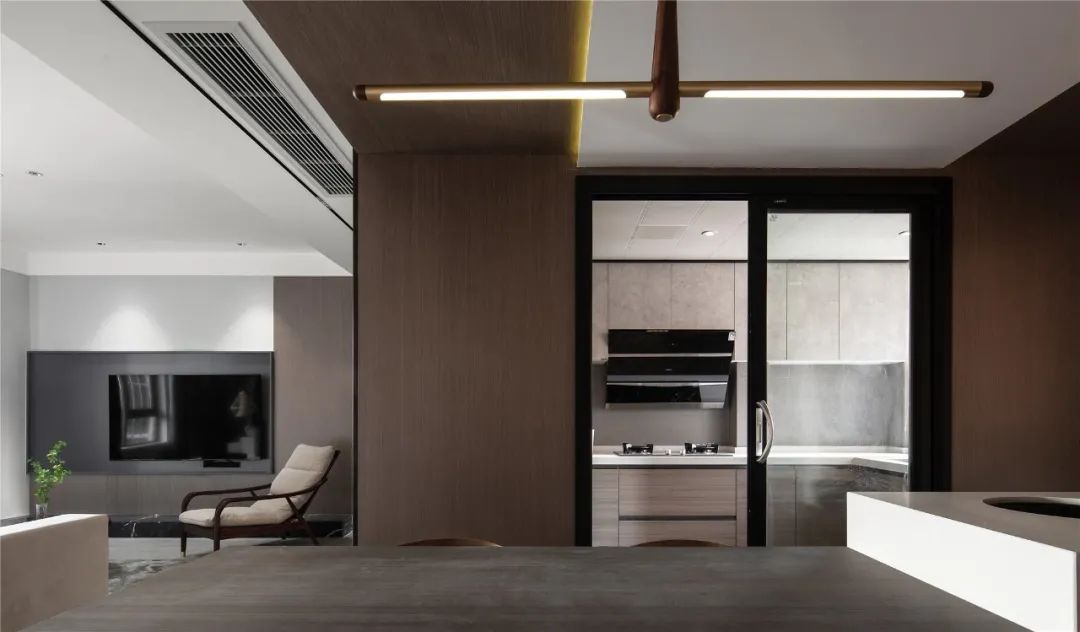 ▲餐厅侧边墙面的木饰面延伸到天花上,并在上方装着灯带,显得更加层次自然而大气。餐厅旁边的厨房空间,定制木色的橱柜,也让做饭空间更加自然舒适而实用。