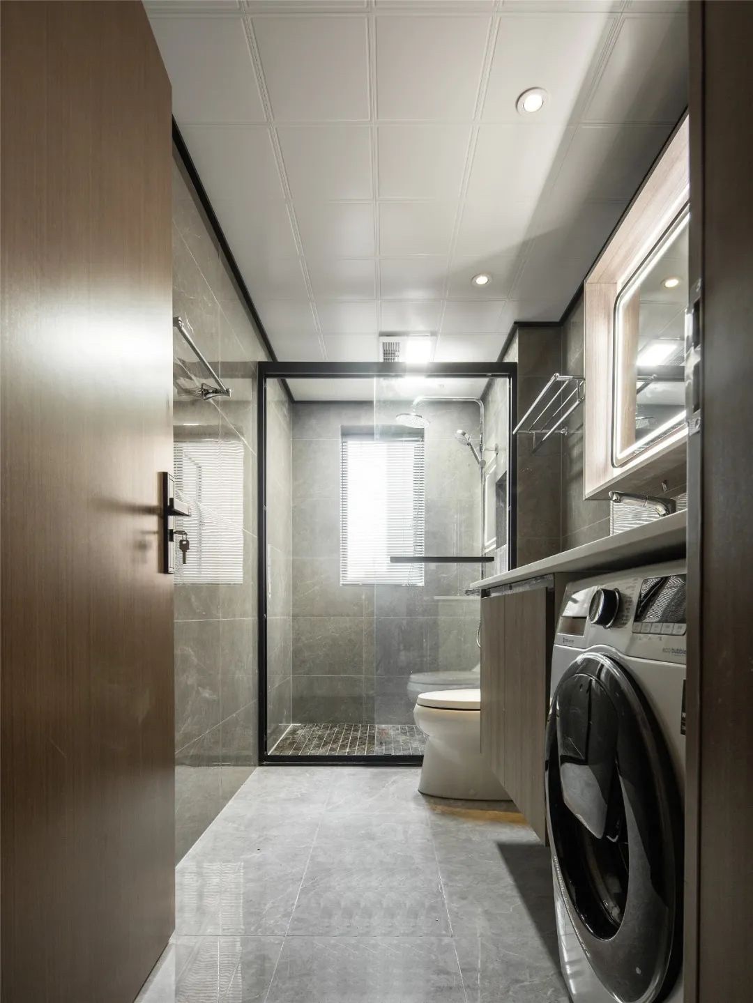 ▲卫生间整体灰色的地面墙面空间,显得简约干净而大气。在进门处的洗手台下放置洗衣机,也是带来了实用方便的生活体验。
