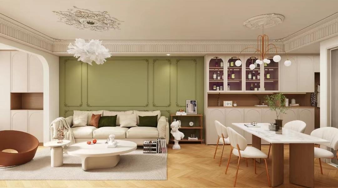 客厅色调选用米白色与绿***撞,法式石膏线的吊顶搭配精致的法式灯盘,视觉上更加凸显立面感让家简约而不简单,给人一种眼前一亮的感觉。
