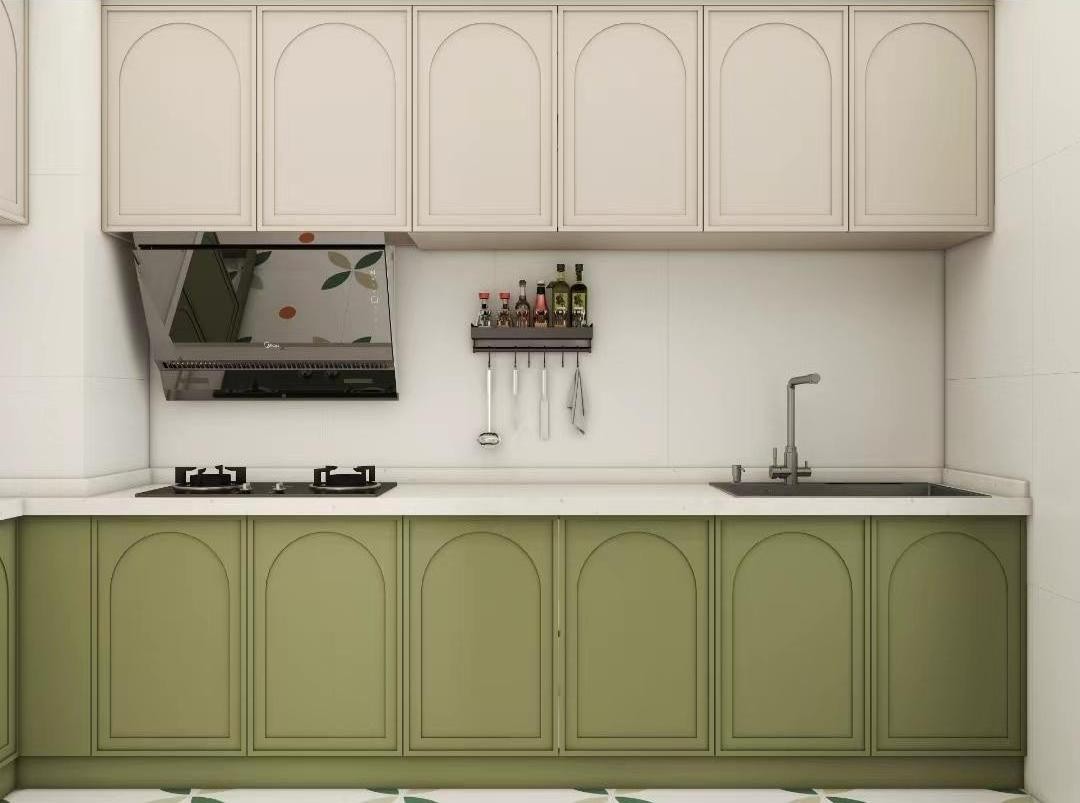抹茶绿地柜搭配米白色吊柜,增加收纳空间,橱柜门板采用法式造型设计,营造明亮轻快的烹饪氛围。