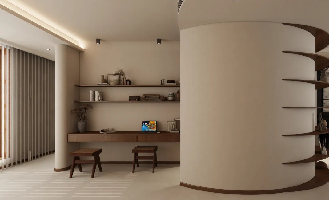 圆弧后增加工作区域,圆弧背景墙的增加,也为工作区域增加了私密性的保护。