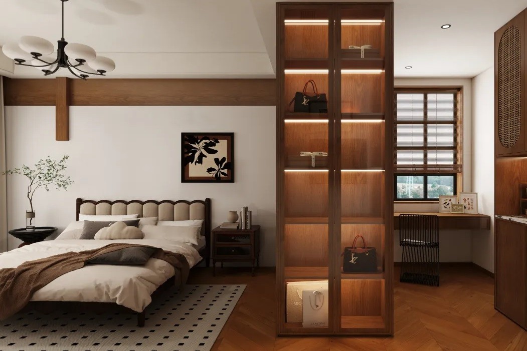 卧室设计风格以新中式为主题,增加了各种灯带进行点缀,并且丰富的使用较大的空间进行储物等。