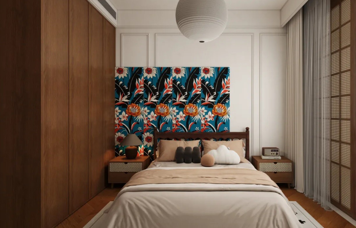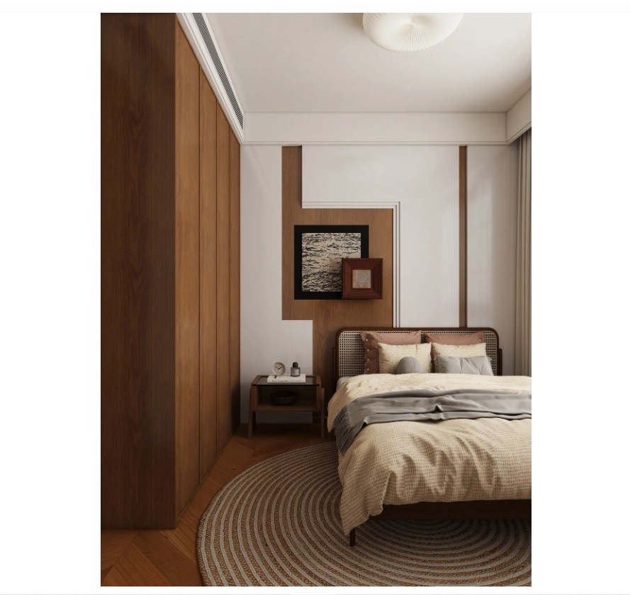 次卧对墙面进行了点缀,给本就以原木色为风格的设计更加丰富。