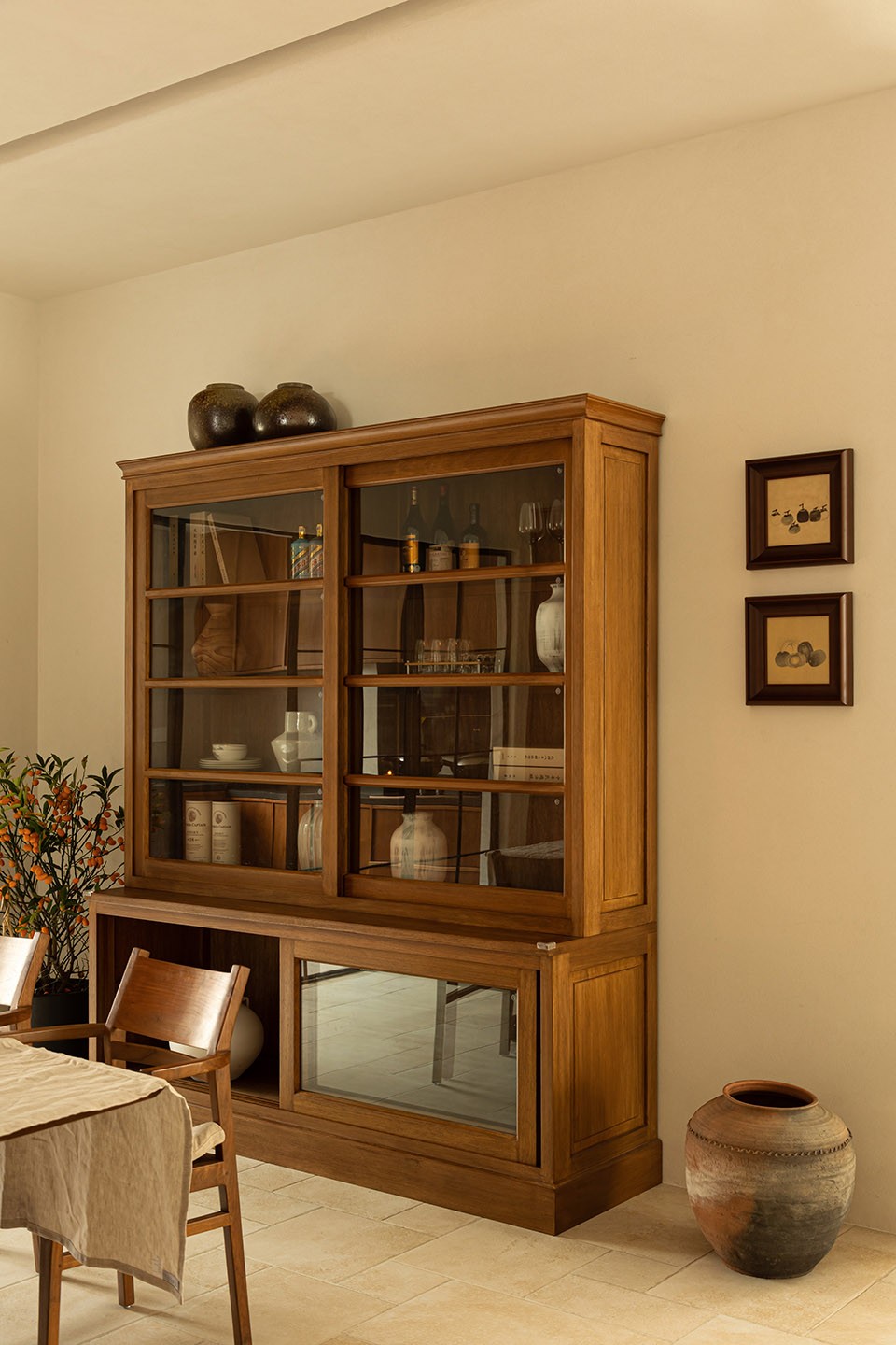 一侧的酒柜静静地伫立,里面陈设各式美酒