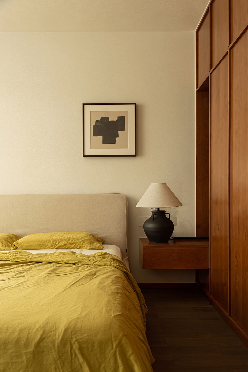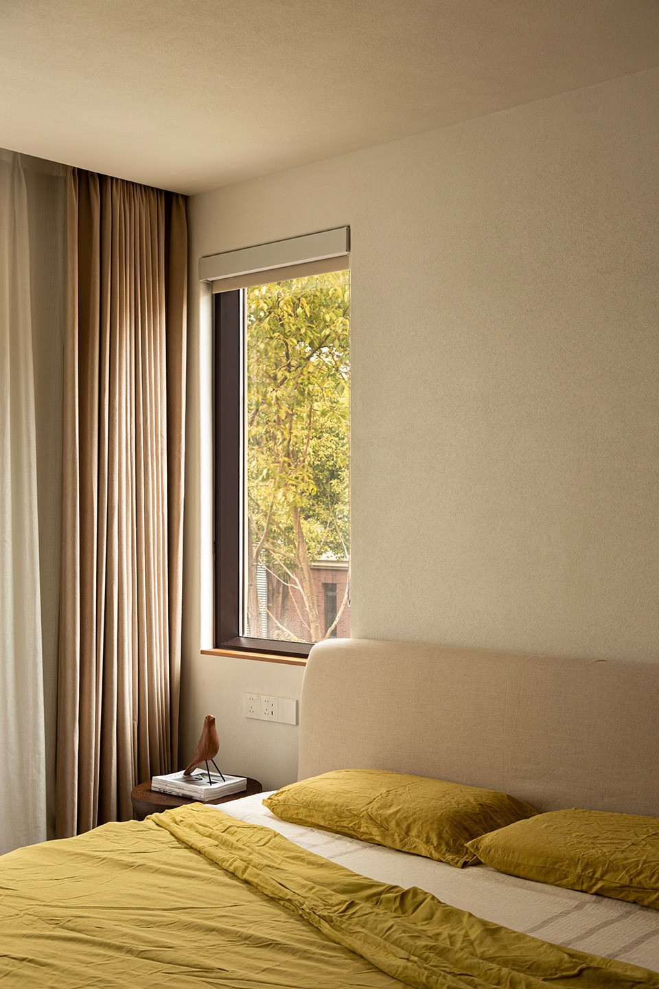 明黄色的床品,相似温暖的阳光,与户外的自然绿色相互交融,每当清晨的光线透过窗帘,洒在室内,那片绿意便如同春天的使者,唤醒沉睡的心灵。