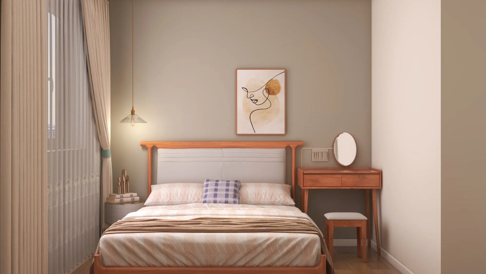 卧室设计注重宁静与舒适,使用原木家具,如木质床头板和夜桌。