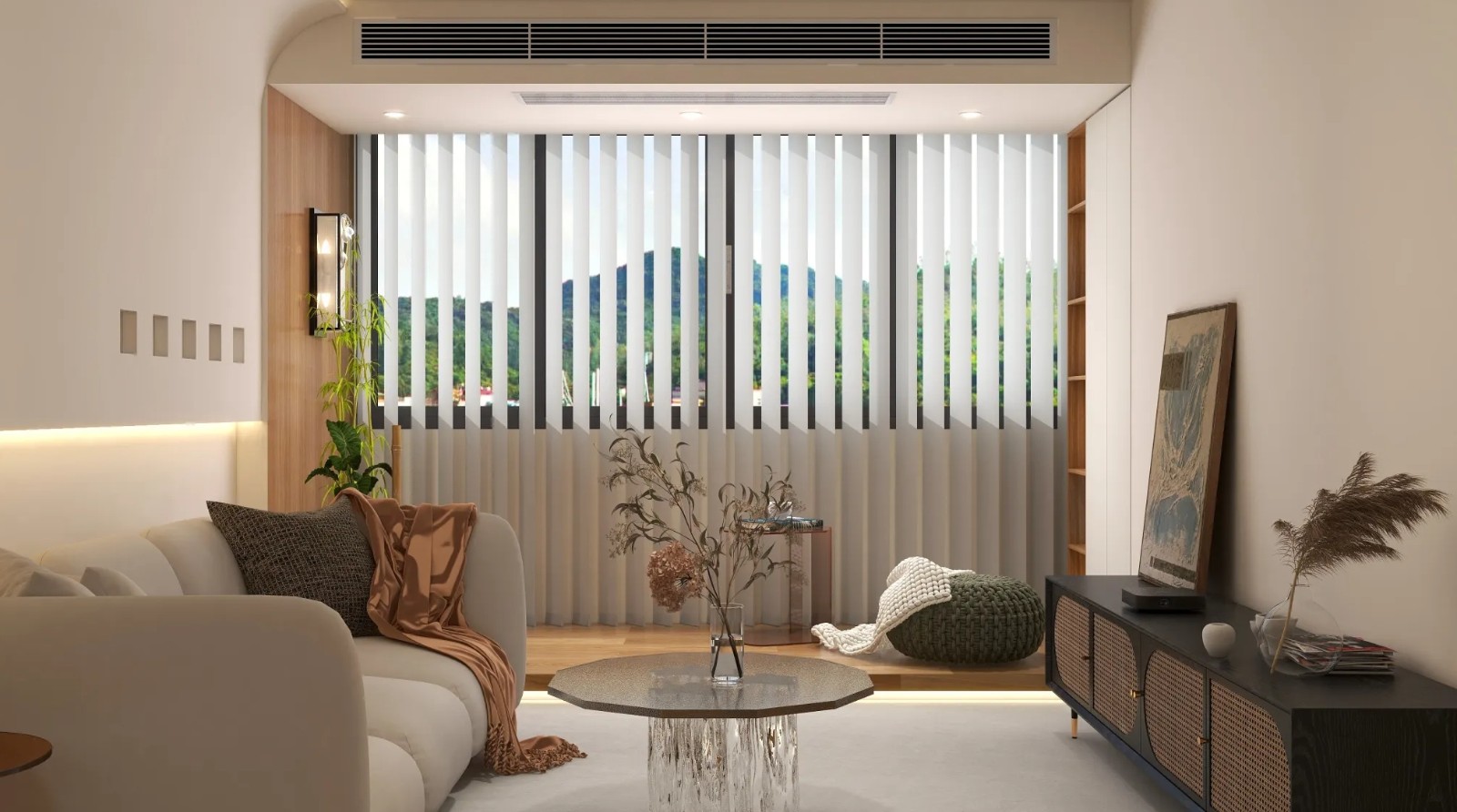 客厅以简约自然为核心,采用温暖的原木地板和天然材质。