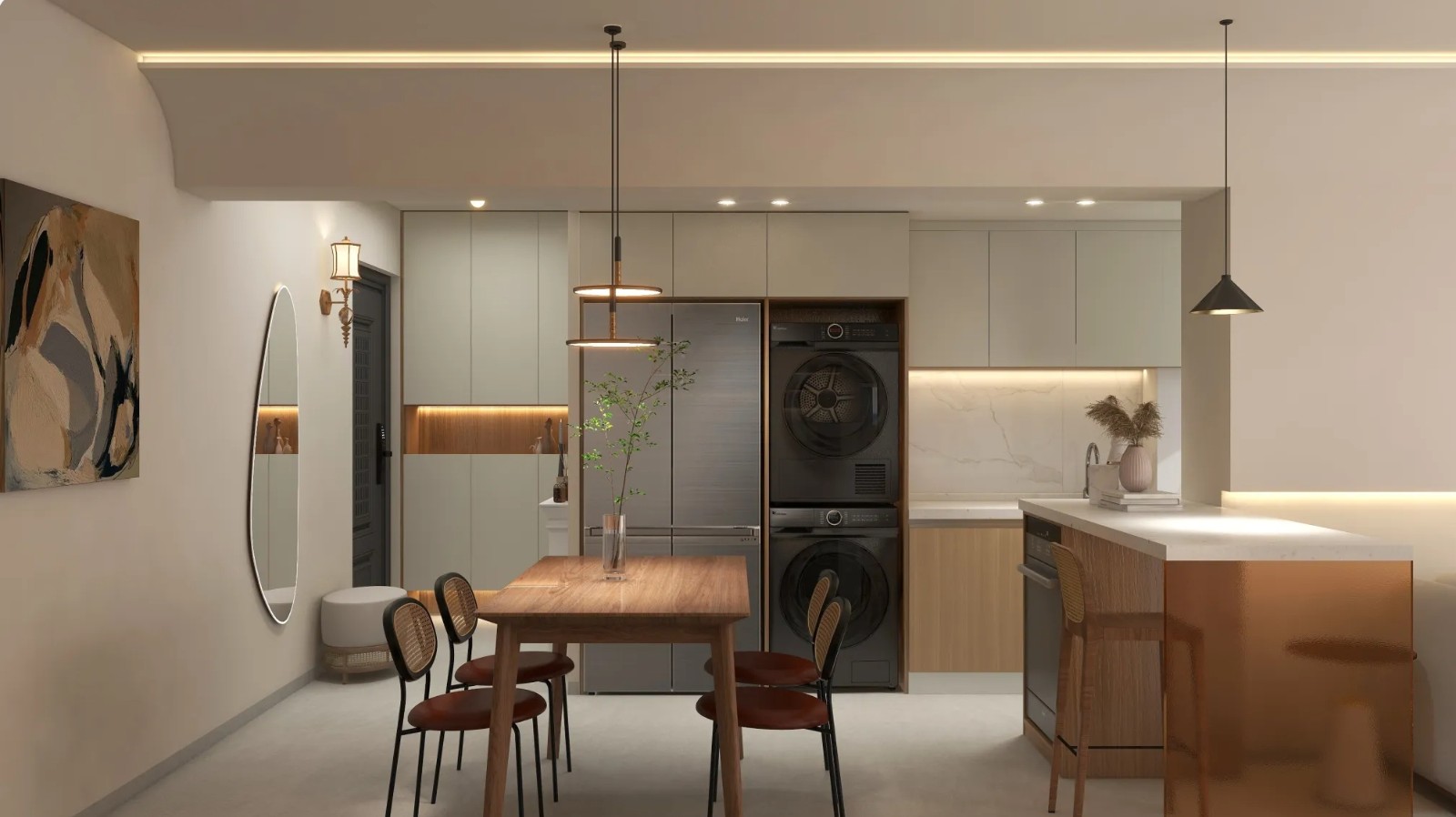 采用开放式厨房,餐厅客厅通过为一个空间,餐桌采用原木的使整个空间更协调