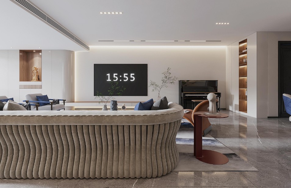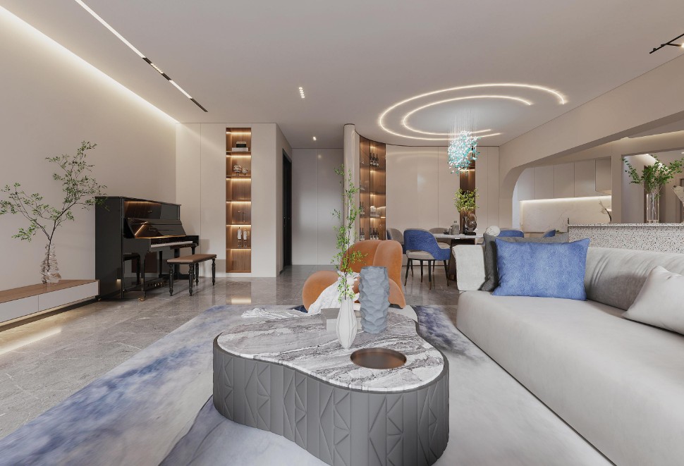 主要采用圆弧形的造型把异形的客厅修饰方式,吊顶跟 圆形灯带也是采用同样的手法,使整个空间看起来更柔和,配上蓝色系的软装使整个客厅不失调性。