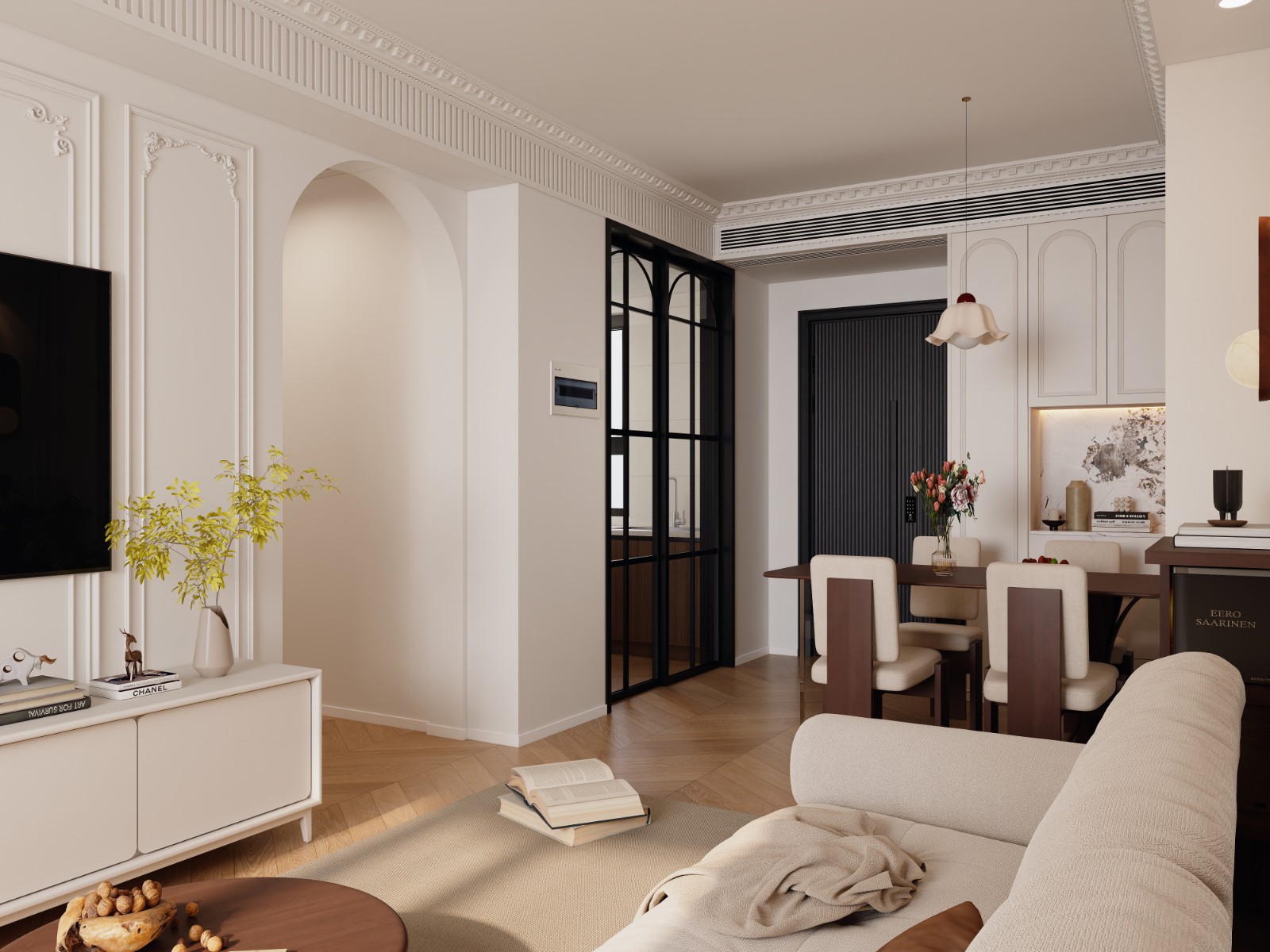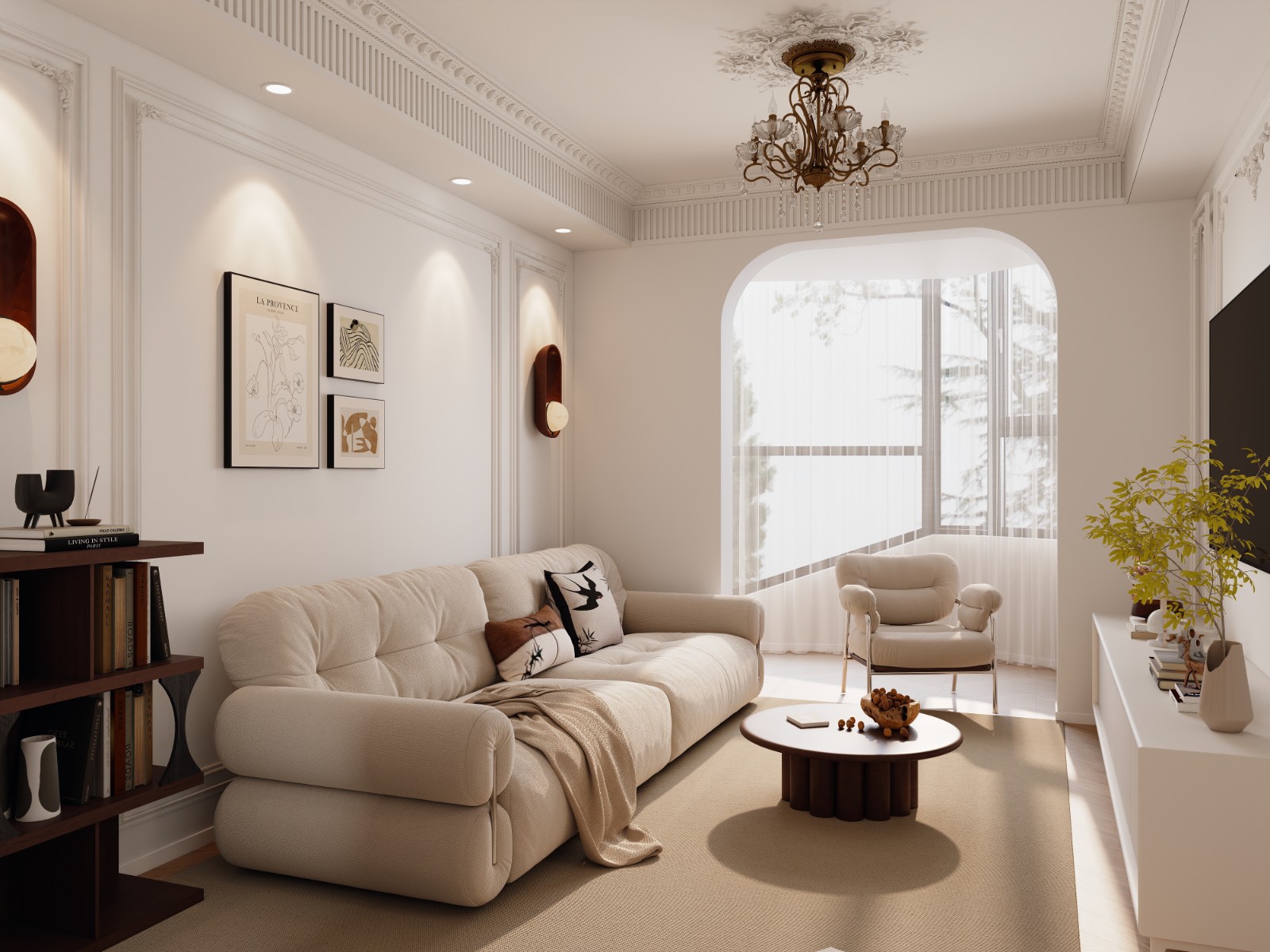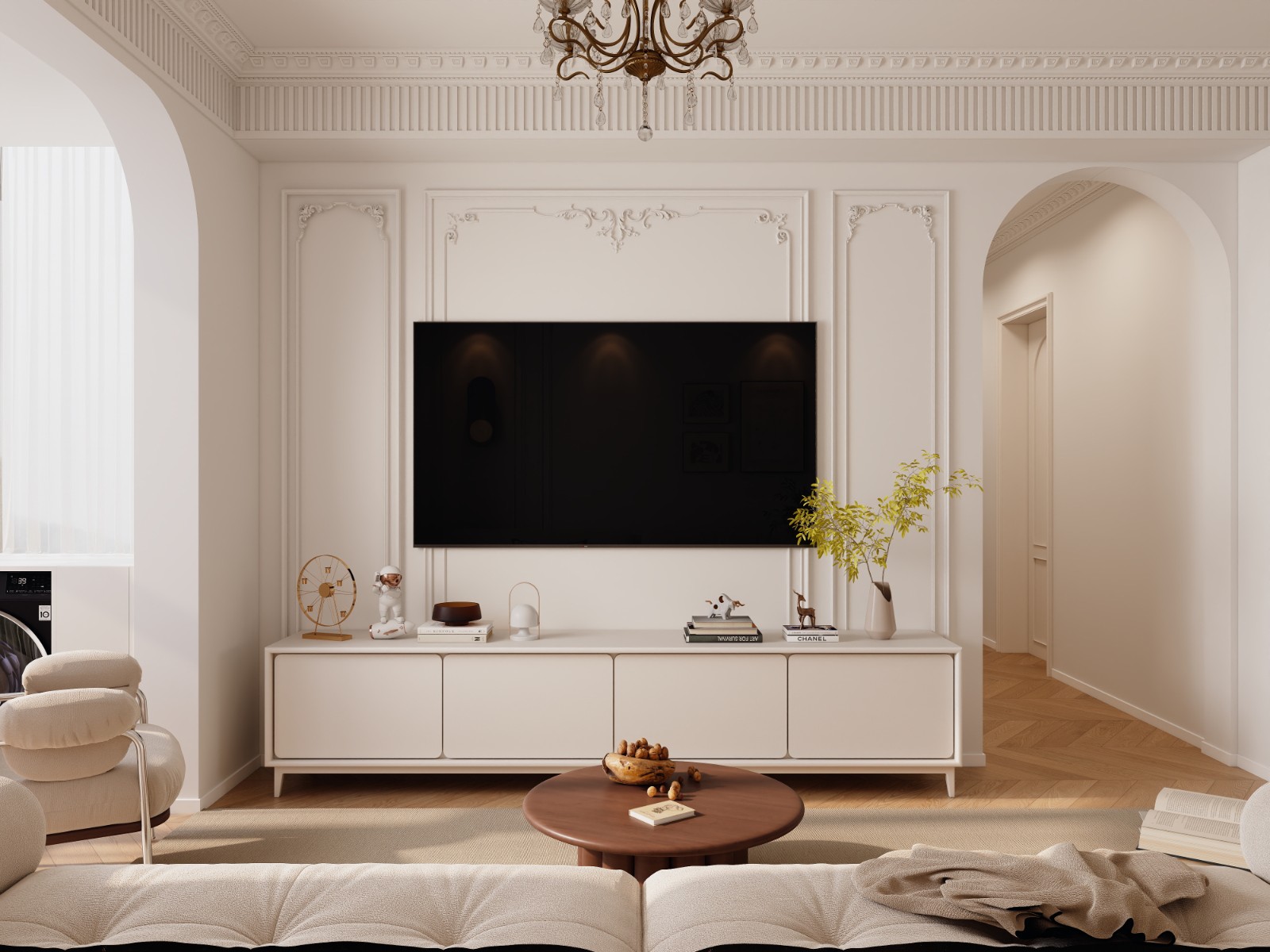 客厅经过精心布置。与电视背景相对的一面特意设计了展示柜,展示柜采用乳白色,使浅橘色为主的客厅显得活泼生动,更通过突出饰品自身的魅力展示主人的富足和品位;地面及部分墙面运用了天然大理石做饰面,显示豪气尊贵。