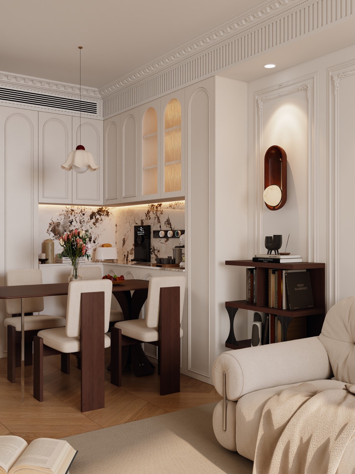 客厅经过精心布置。与电视背景相对的一面特意设计了展示柜,展示柜采用乳白色,使浅橘色为主的客厅显得活泼生动,更通过突出饰品自身的魅力展示主人的富足和品位;地面及部分墙面运用了天然大理石做饰面,显示豪气尊贵,