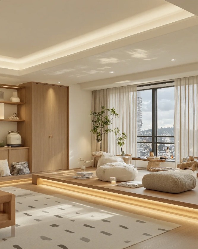 窗边打造了一个抬高的休闲平台,铺上软软的垫子,闲暇时在这里晒晒太阳、看看书,再惬意不过。窗外的景色和室内的温馨完美融合,简直是神仙角落