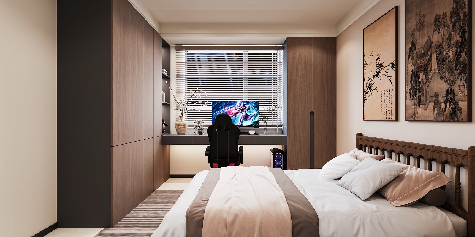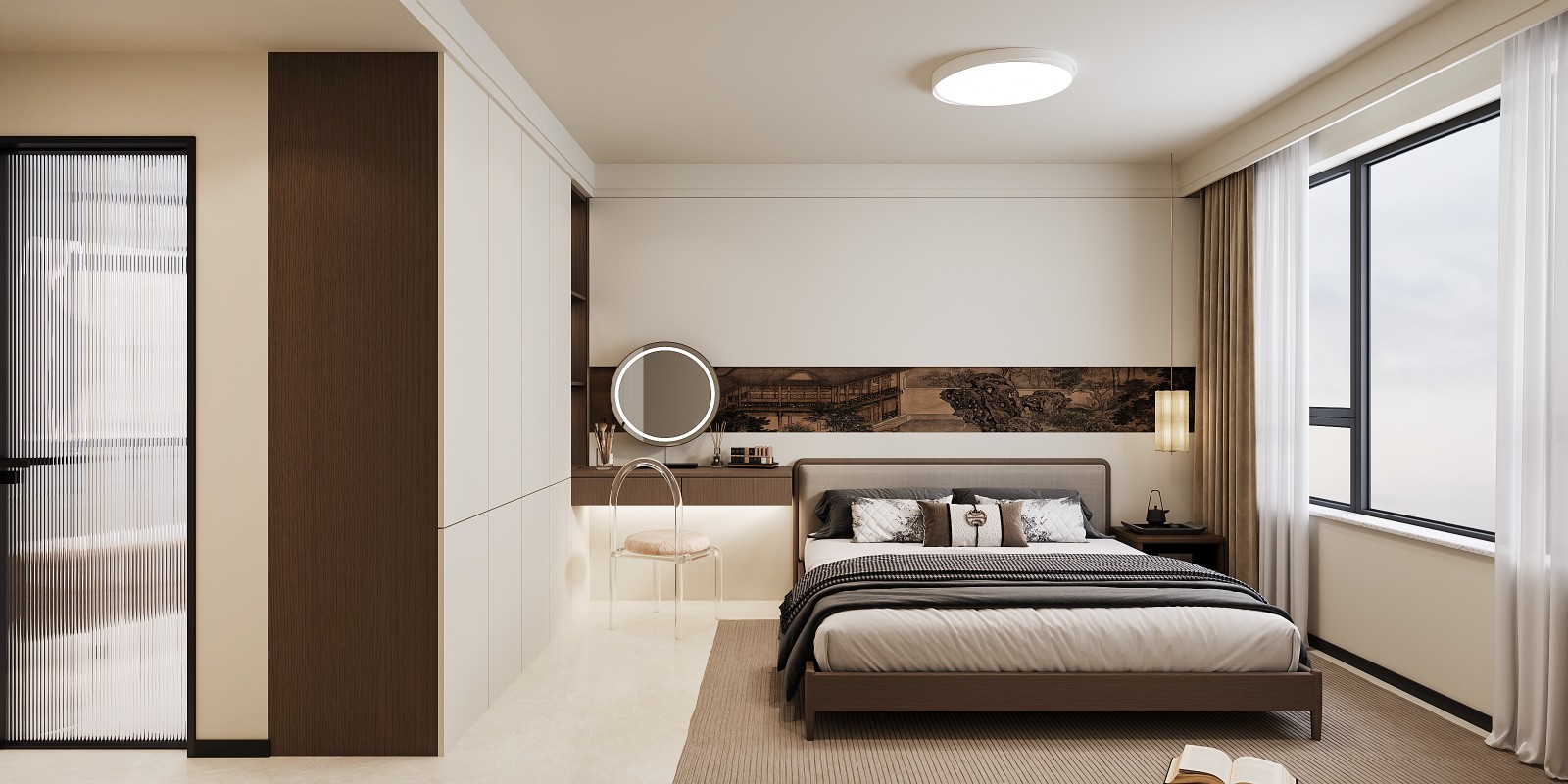 宋氏美学卧室以简约、雅致、内敛为特点,注重营造宁静舒适且富有文化内涵的空间氛围。