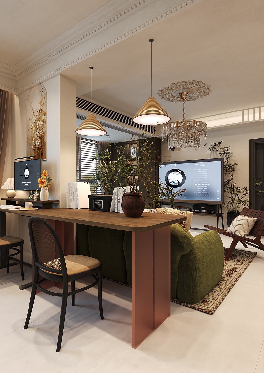 以黑、暖、白、绿、棕为主色调,低饱和度的绿色如祖母绿可用于墙面搭配棕色系木色,营造出自然复古的氛围。