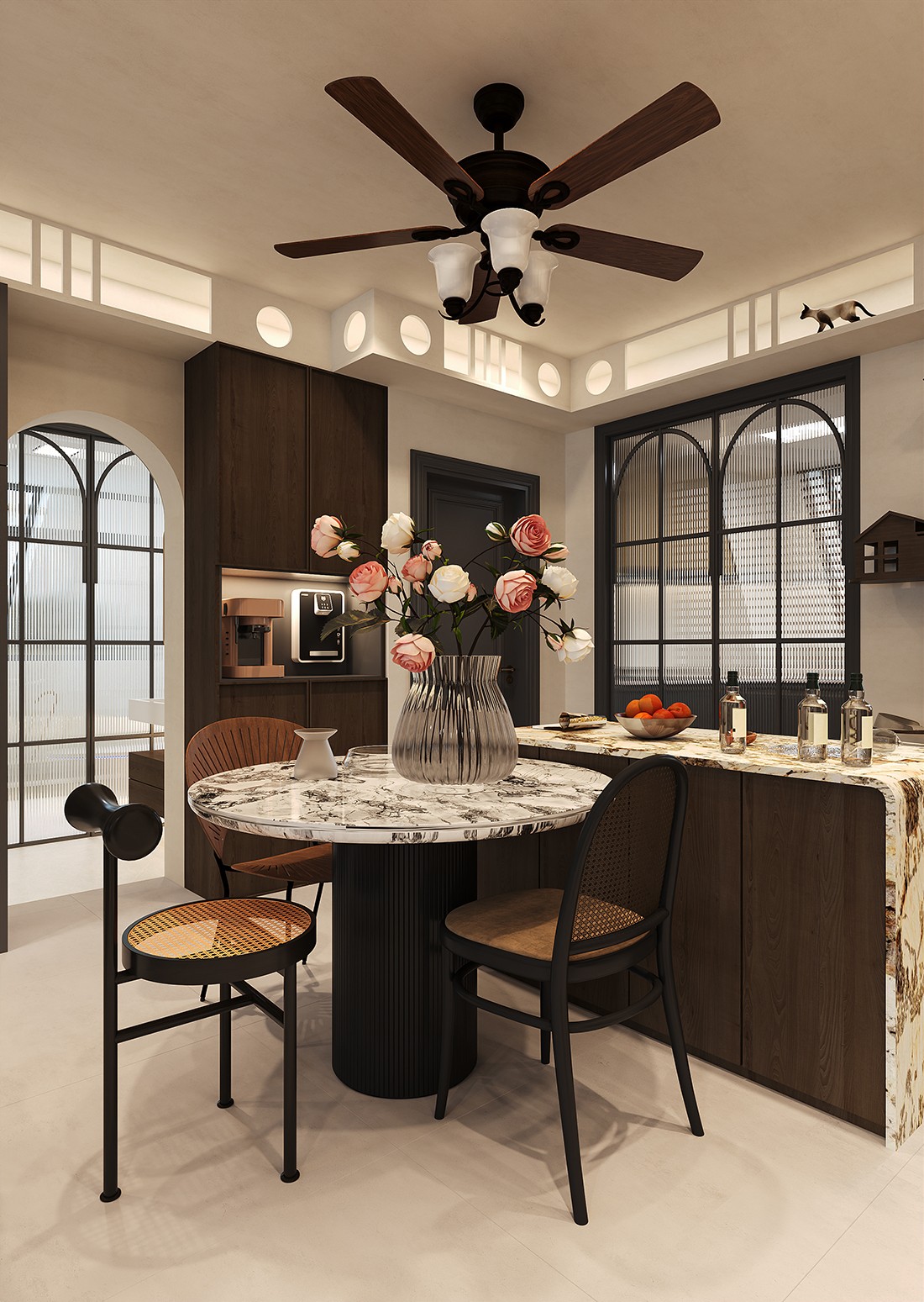 采用奶咖色乳胶漆搭配时尚圆桌,打造简约温柔又具复古感的效果。