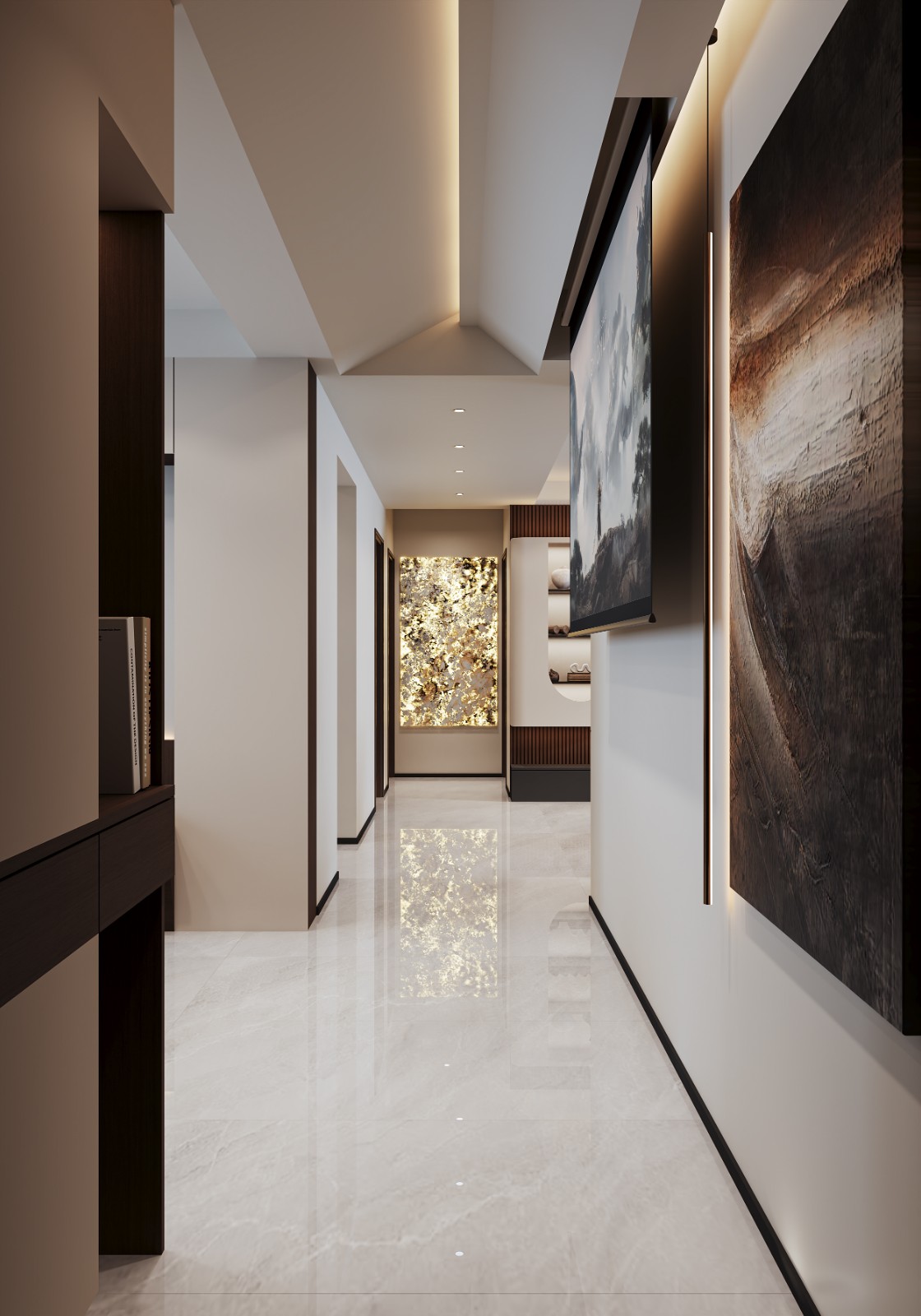 采用多层次照明系统,悬浮顶四周围上一圈灯带作为基础照明,电视背景墙边缘用灯带勾勒轮廓,柜子内部采用层板灯带,营造含蓄的展示效果。