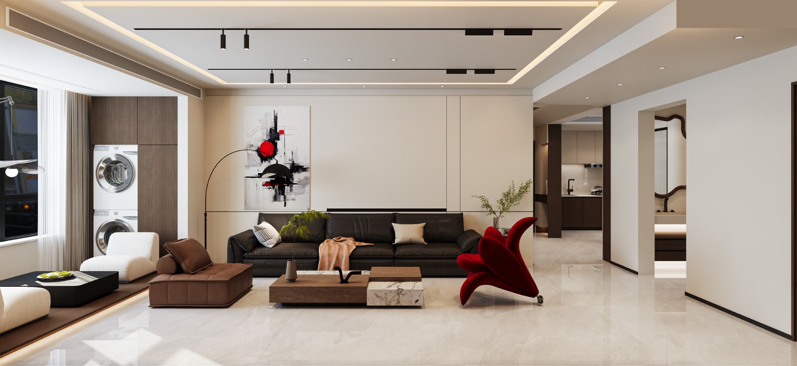 以低饱和的米白、浅灰等中性色打底,搭配胡桃木等深色木质家具或黑色金属装饰,增加层次感。