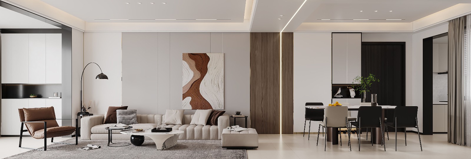 电视背景墙采用岩板+隐形灯带设计,增强层次感; 沙发区与餐厅开放式联动,扩大视觉通透性; 连接南向阳台,引入自然光,配置绿植与休闲椅,打造休闲角落。