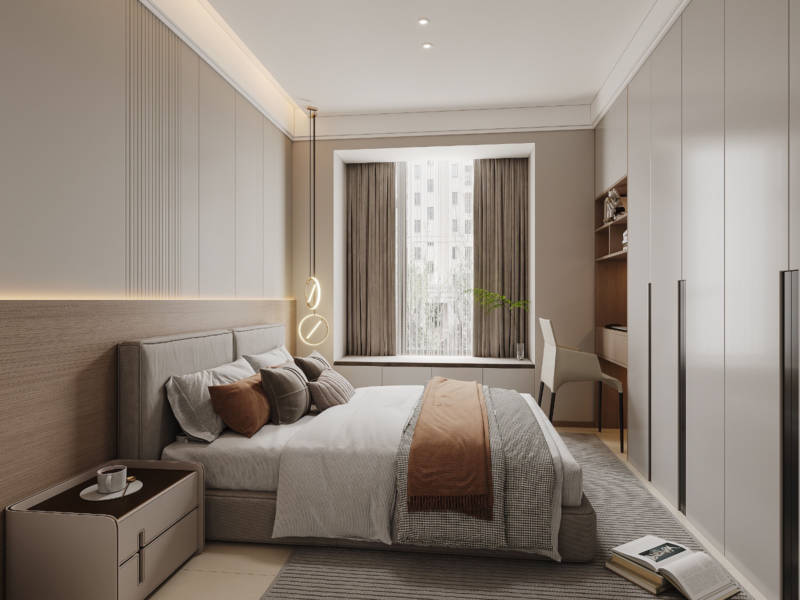 软包床头背景墙+无主灯设计,营造静谧氛围; 定制衣柜与飘窗结合,提升收纳与休闲功能。