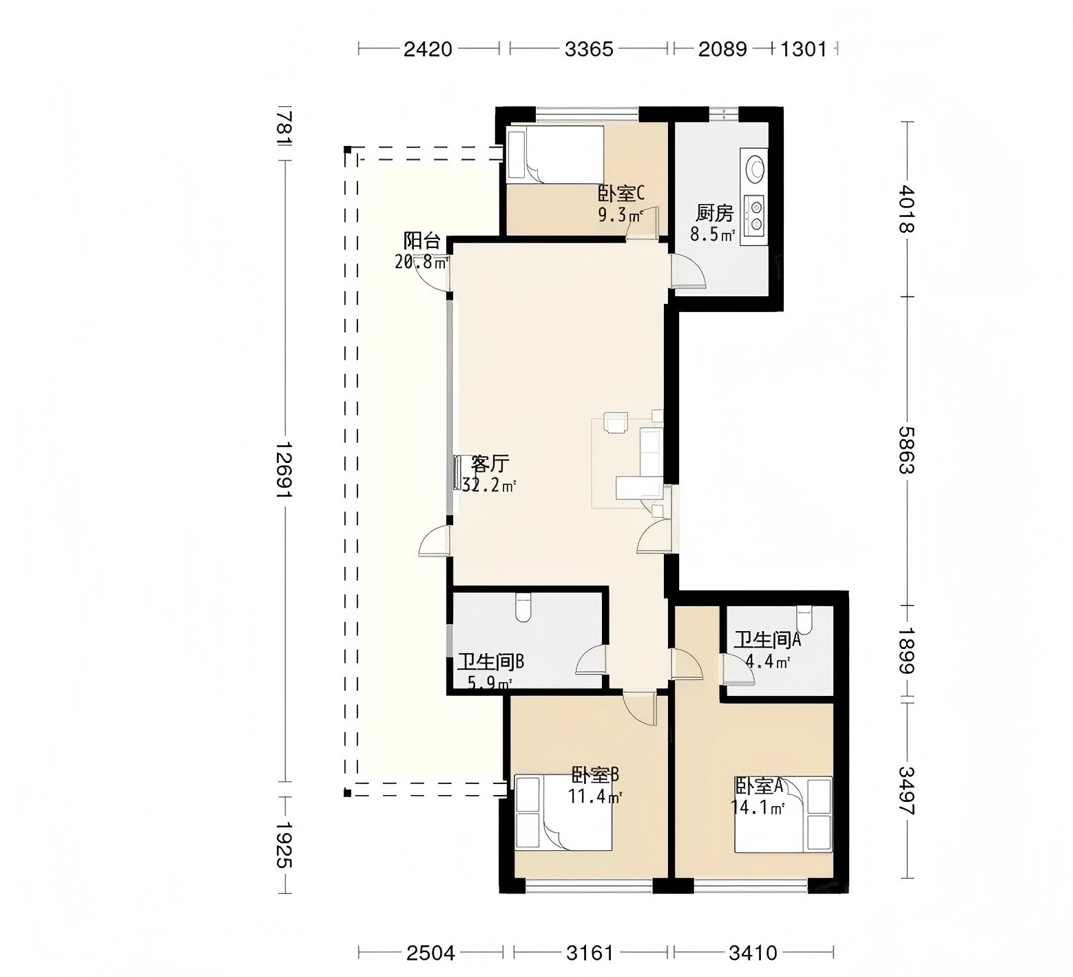 杭州翡翠城118户型为三室两厅现代格局,以开放式客餐厅与多功能卧室设计,营造出明亮宽敞、实用舒适的居住体验。
