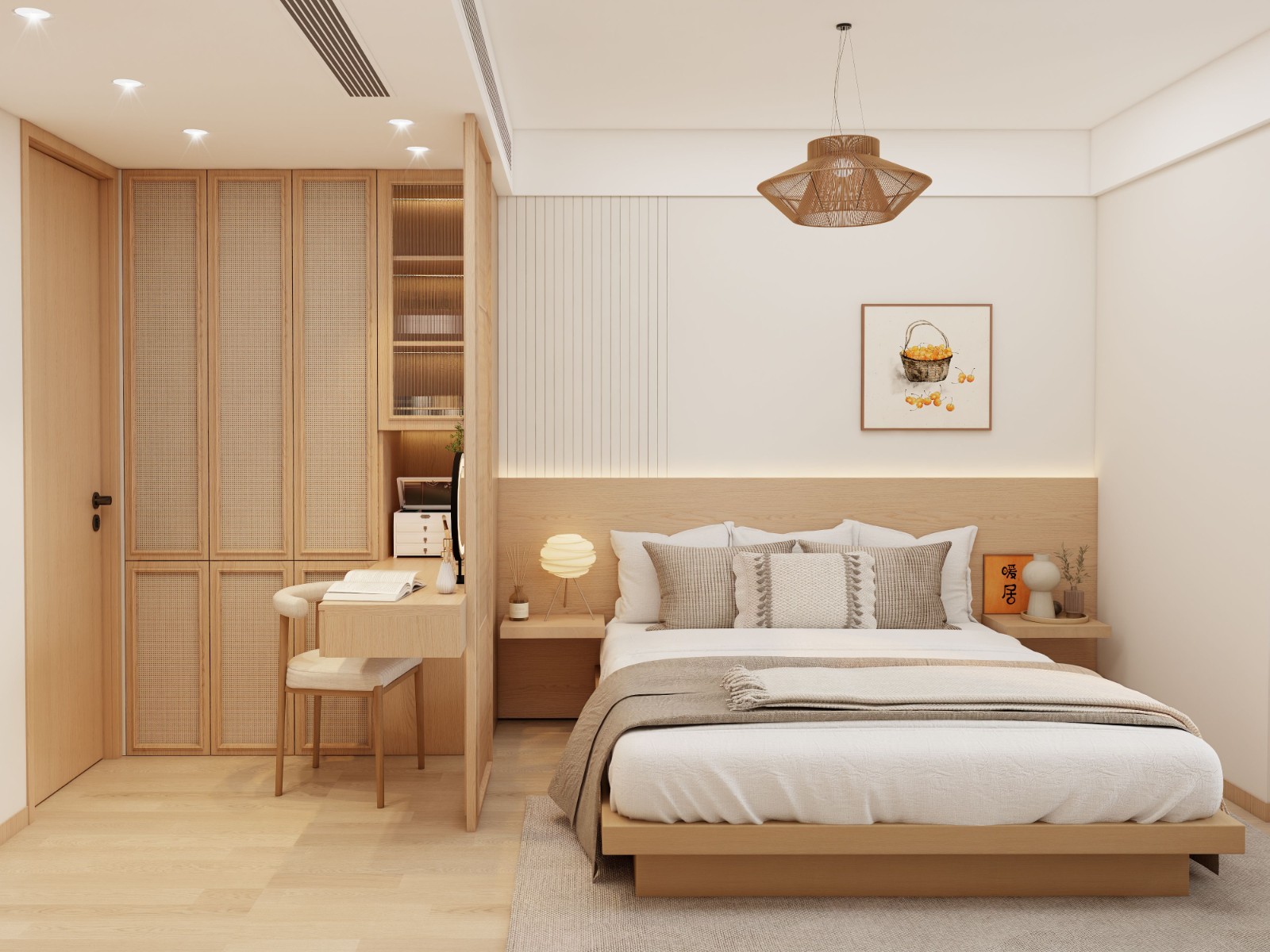 这是原木风卧室,浅木色家具搭配藤编元素,简约柜体嵌书桌,暖光 + 软装,清新柔和,营造舒适自然的休憩空间。