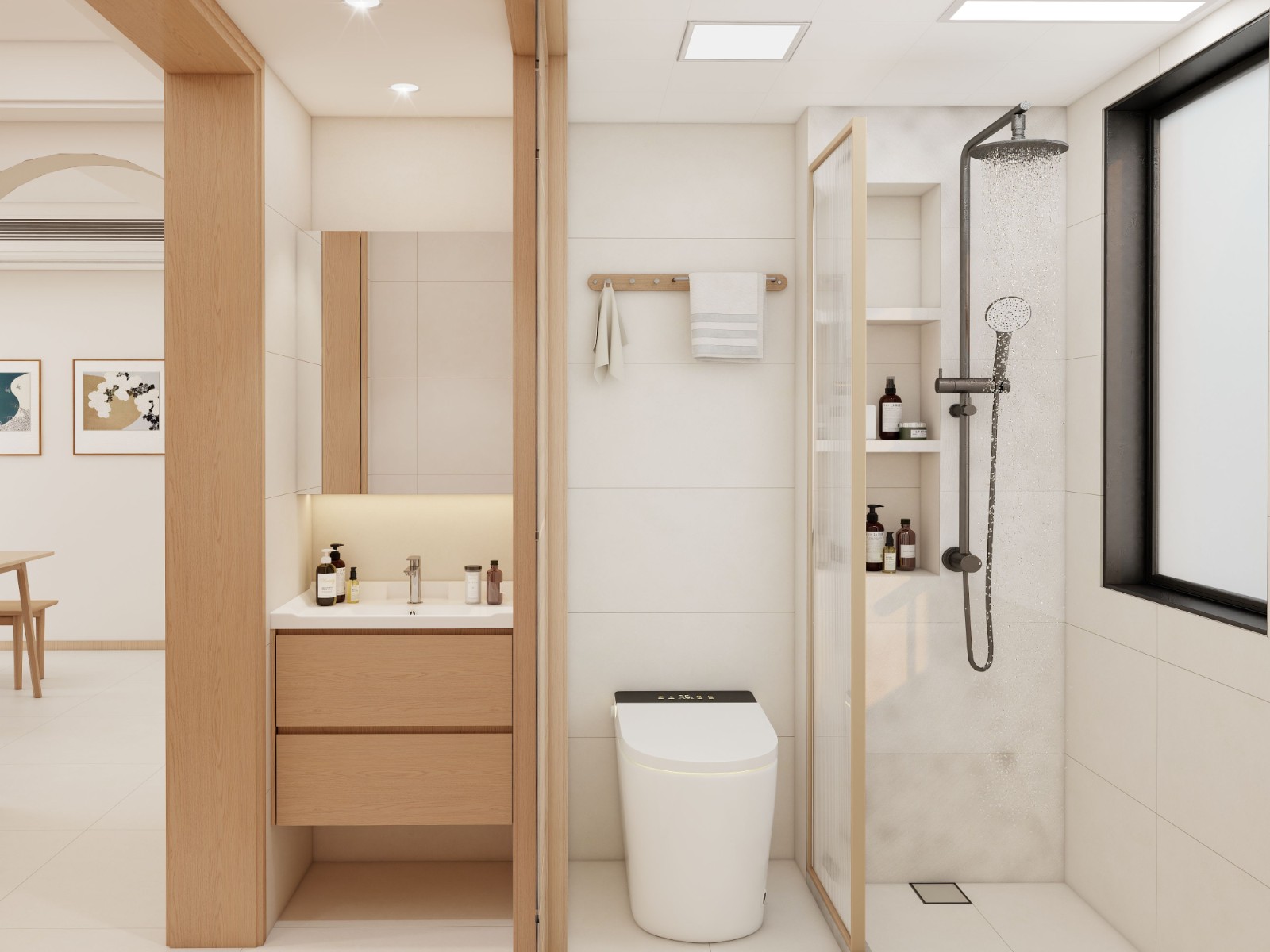 原木风浴室,浅木色浴室柜配白色台盆,干湿分离,白色瓷砖 + 简约五金,壁龛置物,自然清新又实用。