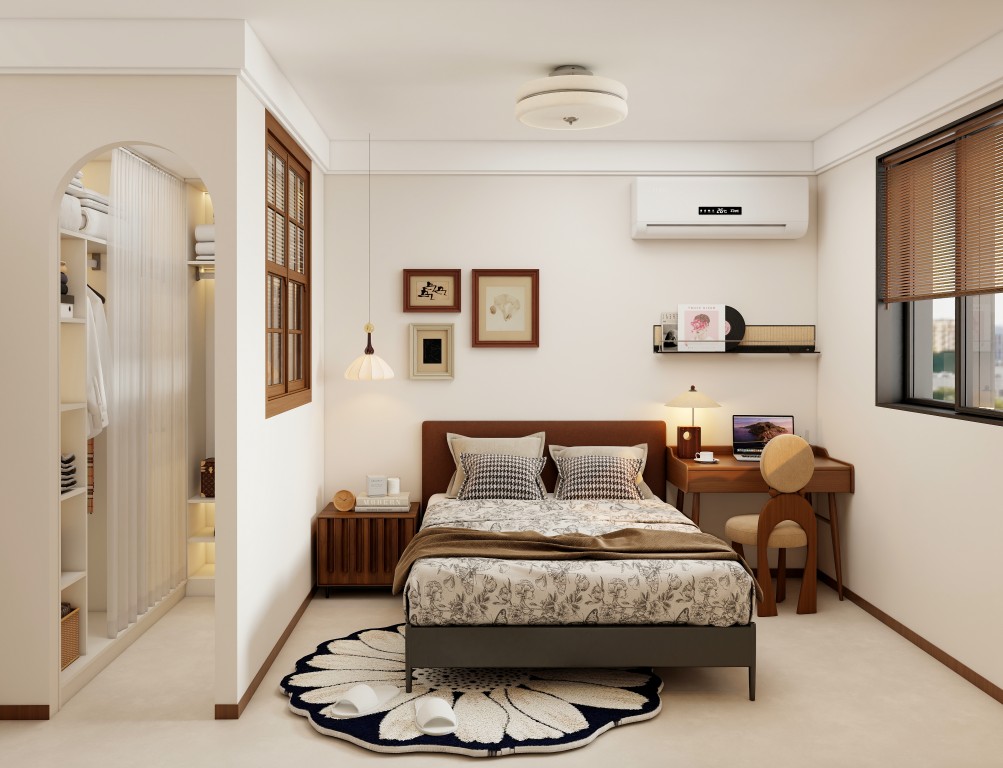 奶油中古风卧室,白墙配棕色实木家具,藤编灯具,复古挂画,花纹床品与花瓣地毯,温馨雅致有韵味。