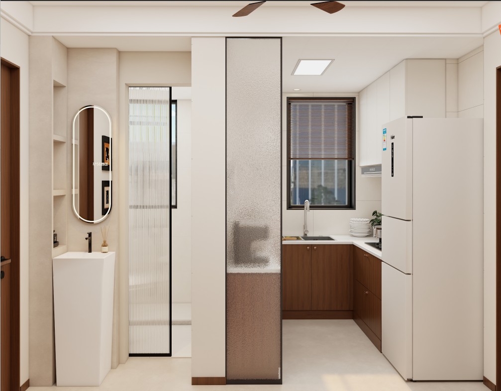 厨房:白棕撞色橱柜,玻璃隔断分隔空间,白色台面配木色地柜,嵌入式家电,简约实用;