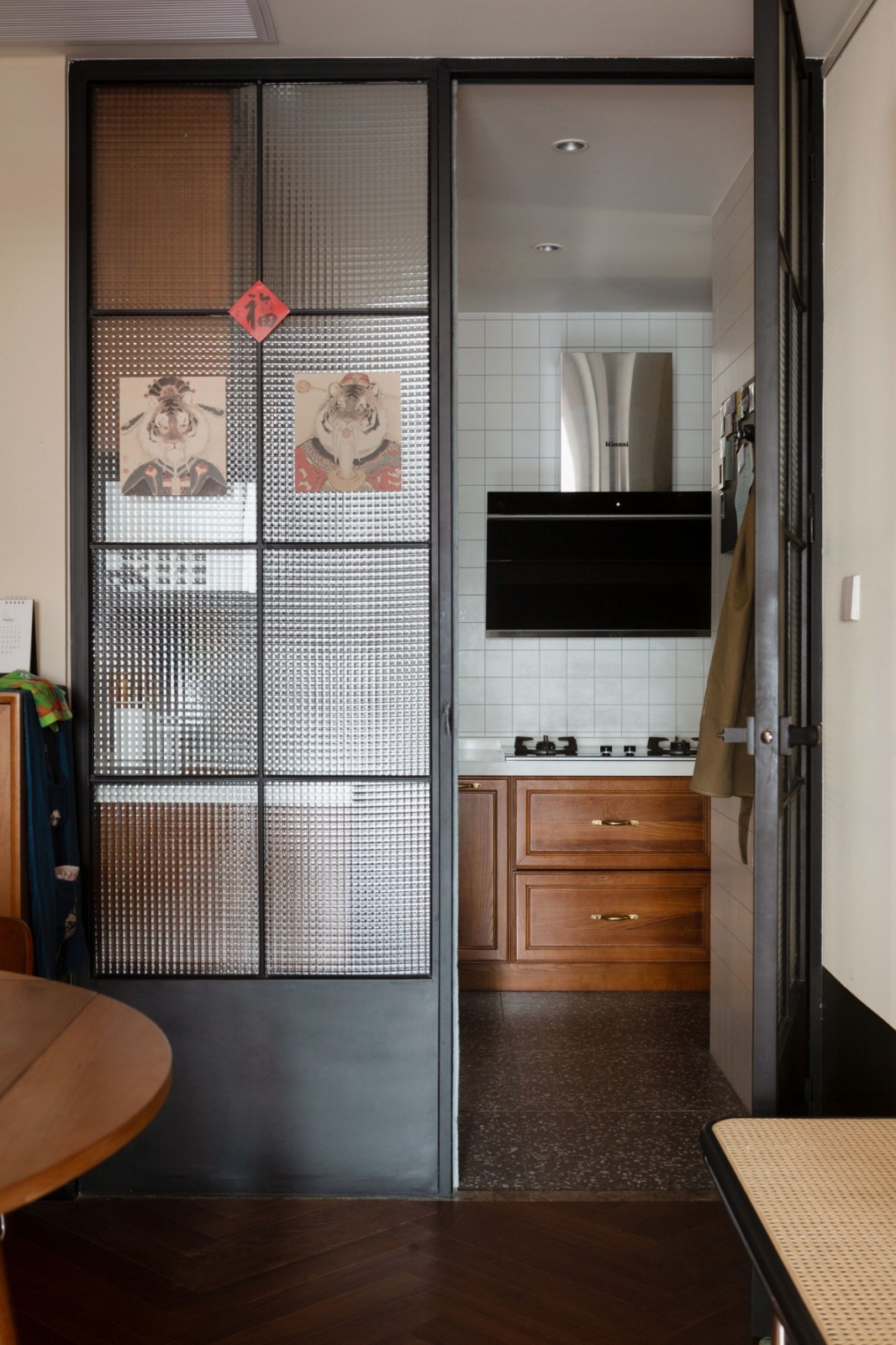 厨房用了长虹玻璃门+木质柜,既挡了油烟又没挡光线,门上贴的“福”字和挂画,是藏不住的生活暖意。