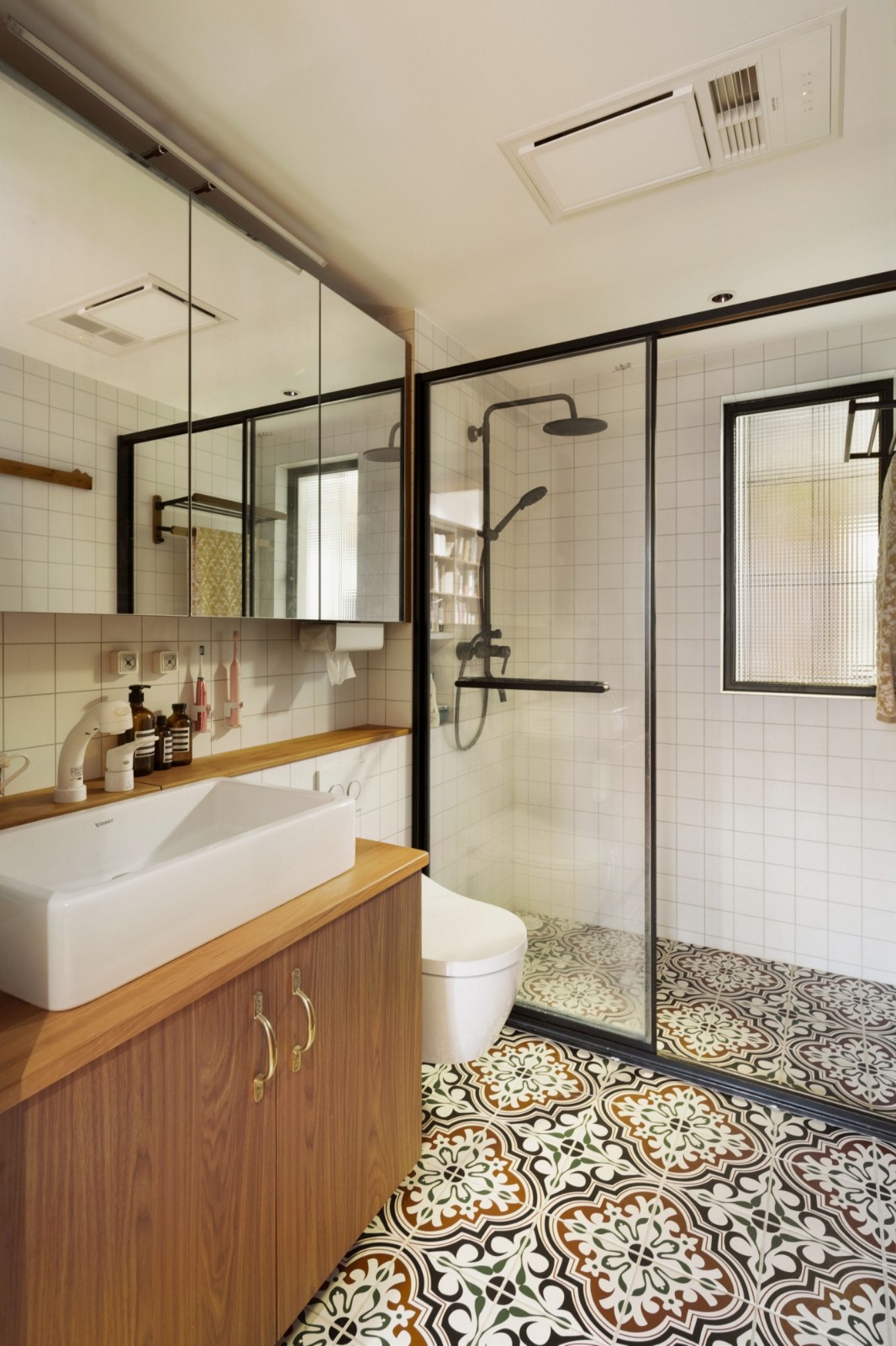 白砖+复古花砖,配上木质台面,把“复古感”藏在实用里;镜柜+壁龛的设计,把瓶瓶罐罐都藏得整整齐齐,生活的烟火气也能干干净净。