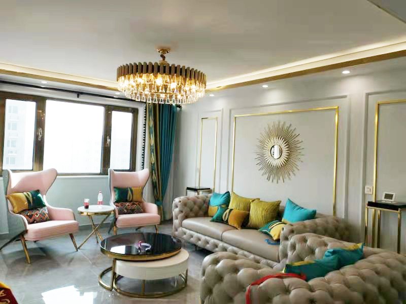 设计师将金色点缀合理分布在整个空间,客厅通铺白色文理地砖,与璀璨吊灯上下呼应,尽显轻奢风范。
