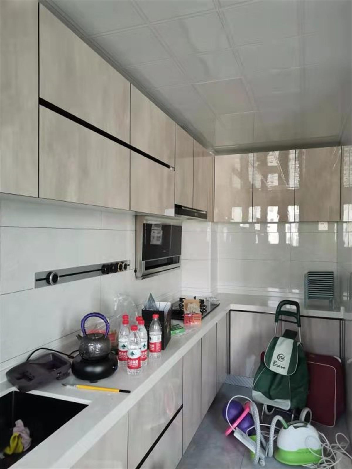 封闭式厨房,白色大理石瓷砖,淡黄色橱柜,简洁明亮。
