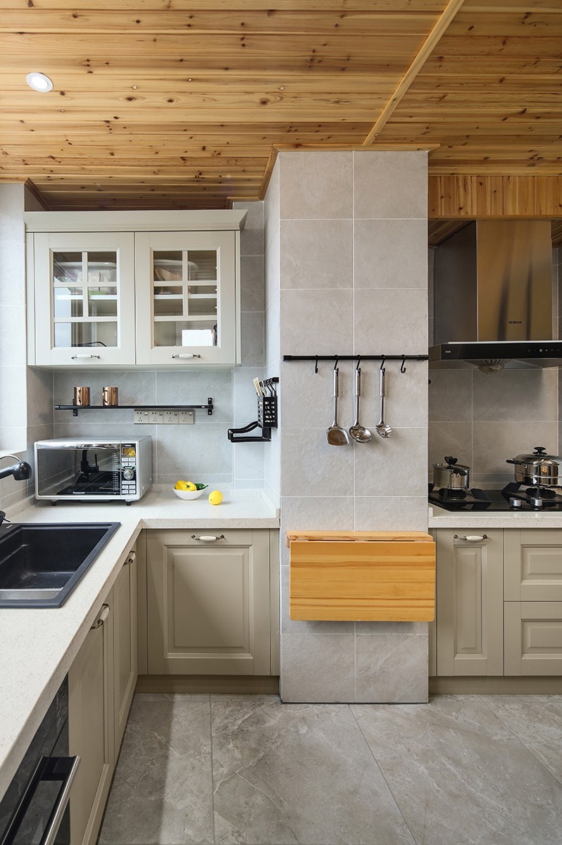 橱柜设计中,下柜有一处做了断开设计,是一个特别的出发点,业主更习惯于使用小推车等更具灵活性的工具,可以存放日常采购回来的新鲜果蔬,上柜设计了台面操作灯,解决顶面光源“背光黑”的问题。 厨房的阳台做了独立的家政阳台。